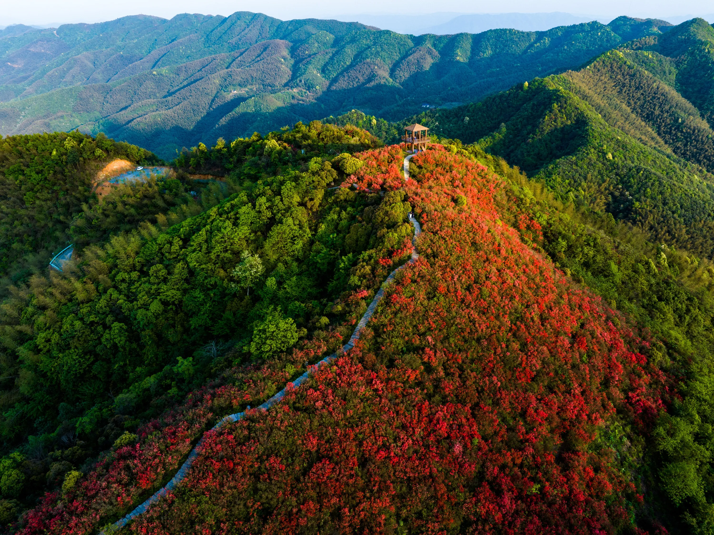 Aerial view of azalea flowers in full bloom on the ridge on April 20, 2023 in Pingxiang, Jiangxi Province of China. (Photo by VCG/VCG via Getty Images)