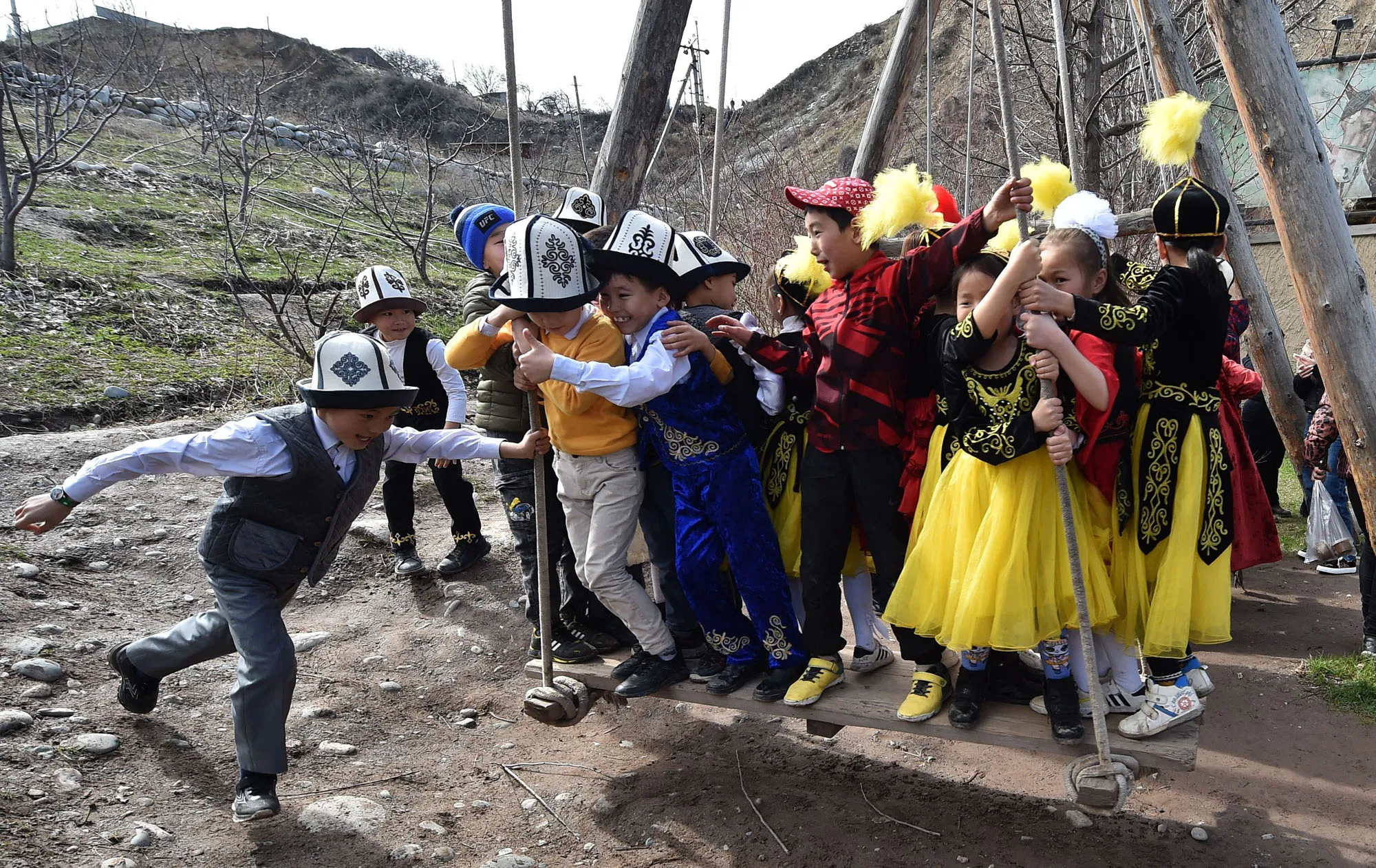 Children wearing traditional costumes play on a swing during the celebration of Nowruz (New Year) in Bishkek on March 21, 2022. Nowruz, “The New Year” in Farsi, is an ancient festival marking the first day of spring in Central Asia. (Photo by Vyacheslav Oseledko/AFP Photo)