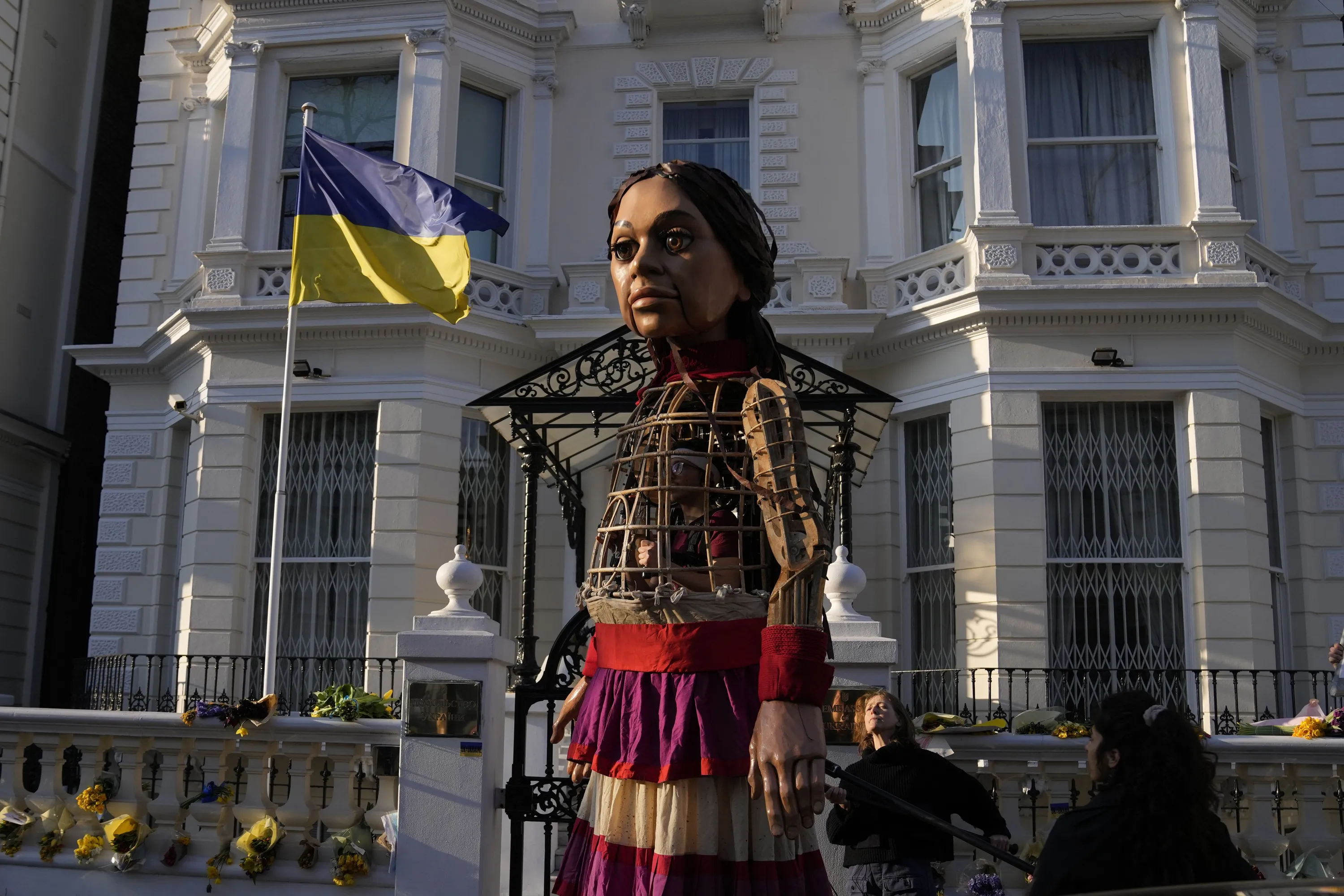 Refugee puppet Little-Amal makes an appearance outside the Ukrainian Embassy to highlight the plight of people feeling the Russian invasion of Ukraine, in London, Thursday, March 10, 2022. A U.N. agency and others tracking migration say 2 million people have fled Ukraine in the two weeks since Russia's invasion. (Photo by Alastair Grant/AP Photo)