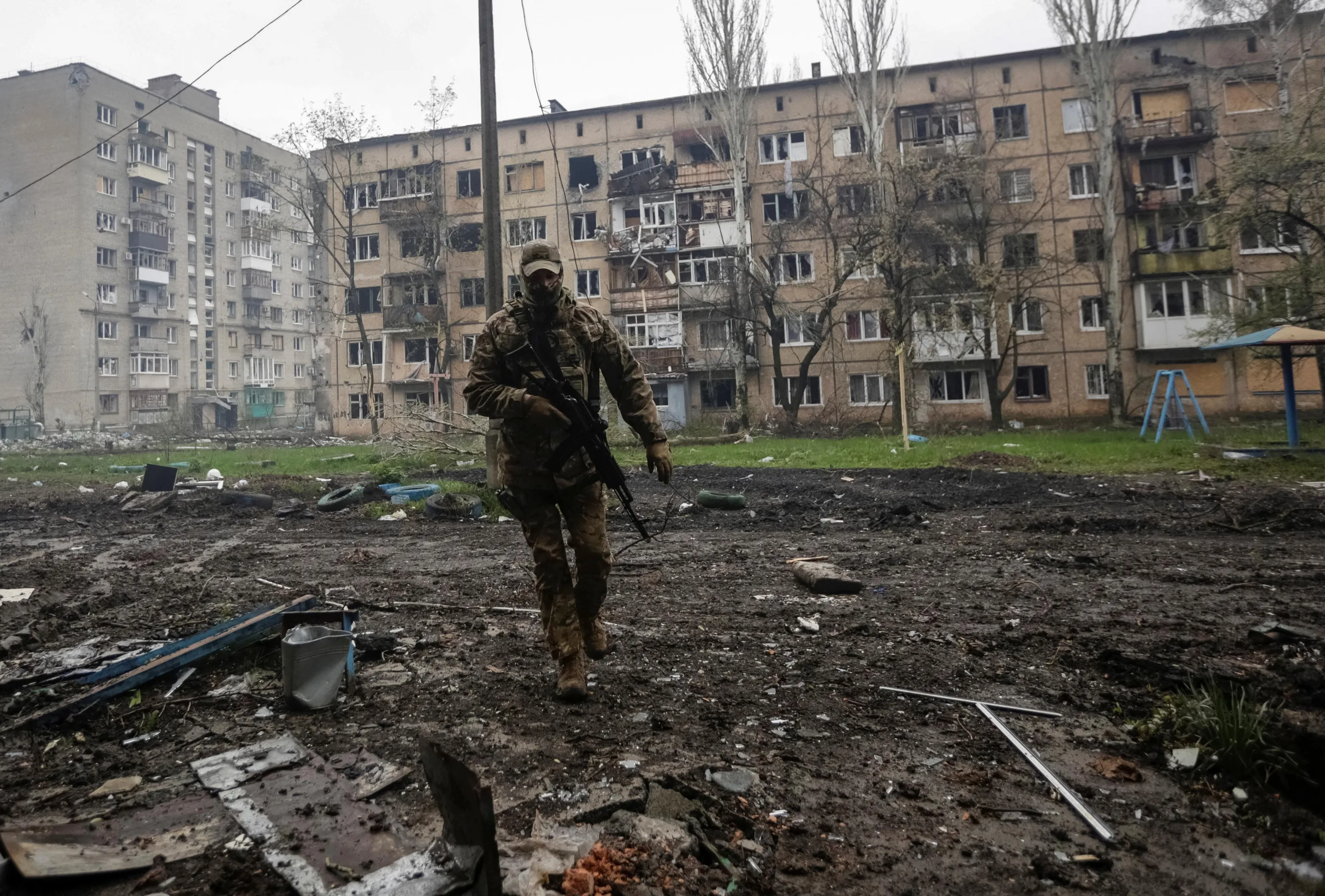 A Ukrainian service member walks near damaged residential buildings in the front line town of Bakhmut, Ukraine on April 21, 2023. (Photo by Anna Kudriavtseva/Reuters)
