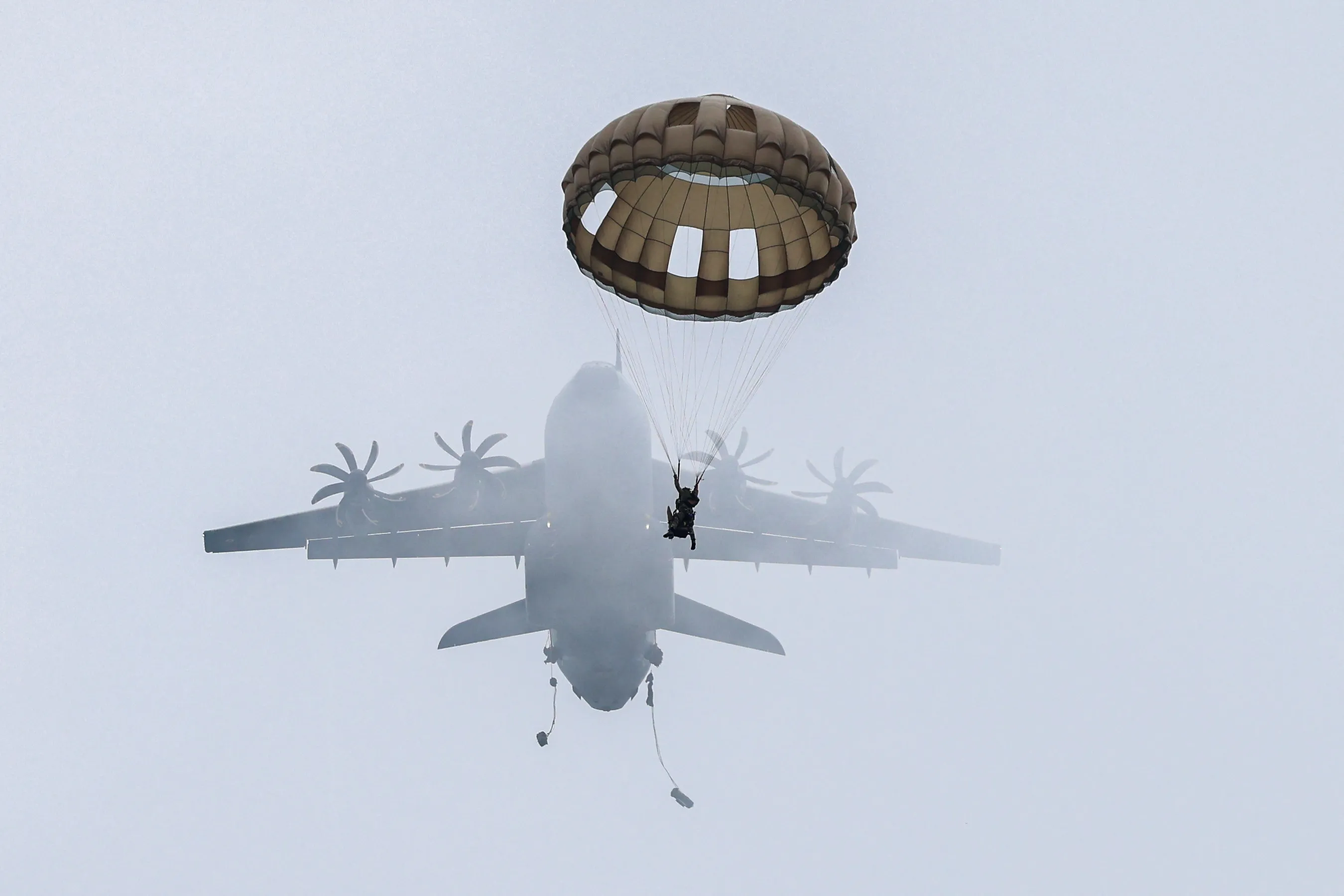 A French paratrooper parachutes from a A400M aircraft during a large-scale military drill called “Orion” in Castres, southwestern France, on February 25, 2023. (Photo by Charly Triballeau/AFP Photo)