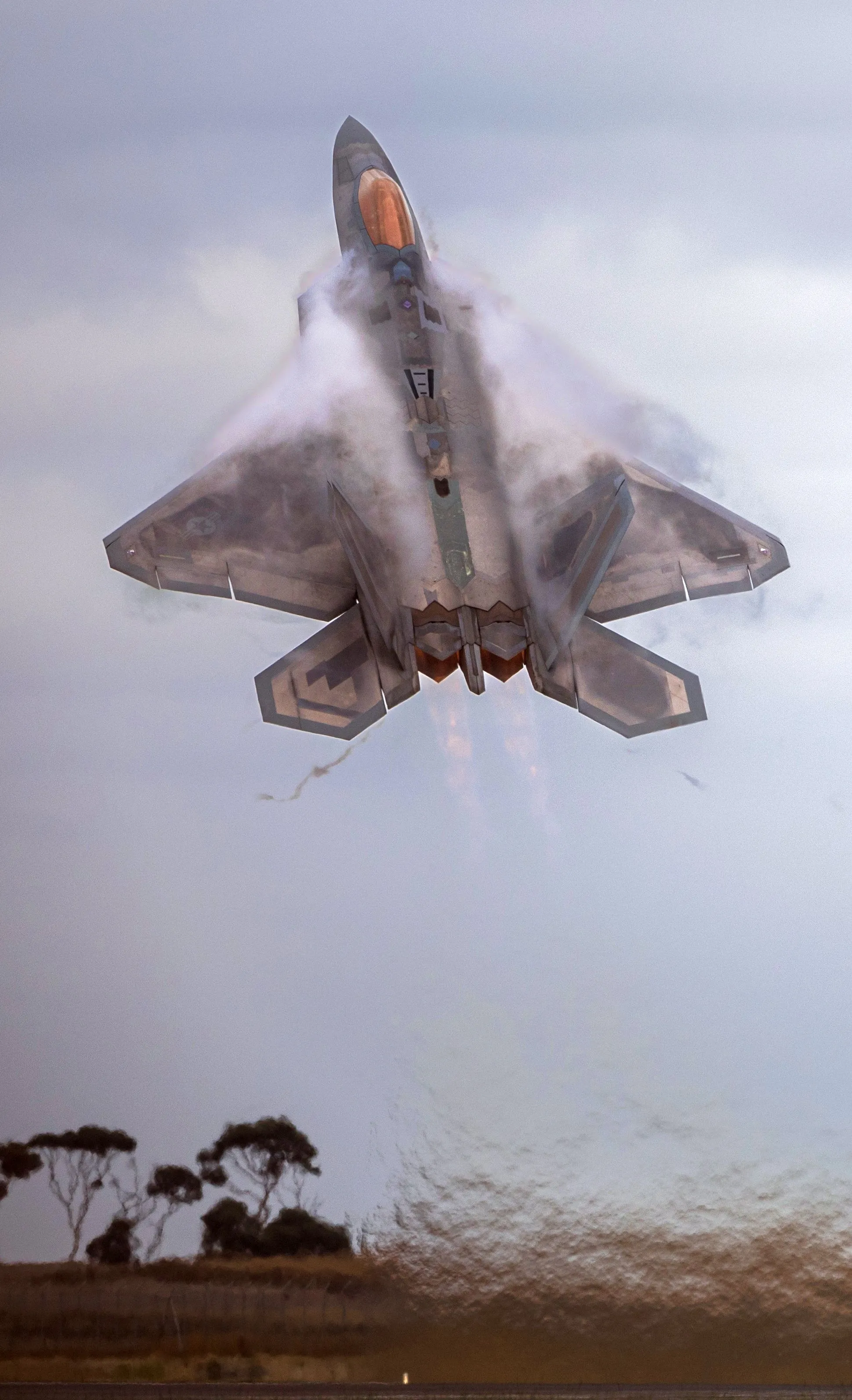 A USAF F-22 Raptor flying during a solo handling display on February 28, 2023 in Avalon, Australia. The 2023 Australian International Airshow & Aerospace and Defence Exposition (AVALON 2023) opened today. Organizers say there is a 14 percent increase over the 2019 event in exhibitors, and nearly 50 percent more industry, government, defence and scientific delegations. The show comes at a time of increasing military tension in both the Asia-Pacific and North Asia. (Photo by Asanka Ratnayake/Getty Images)