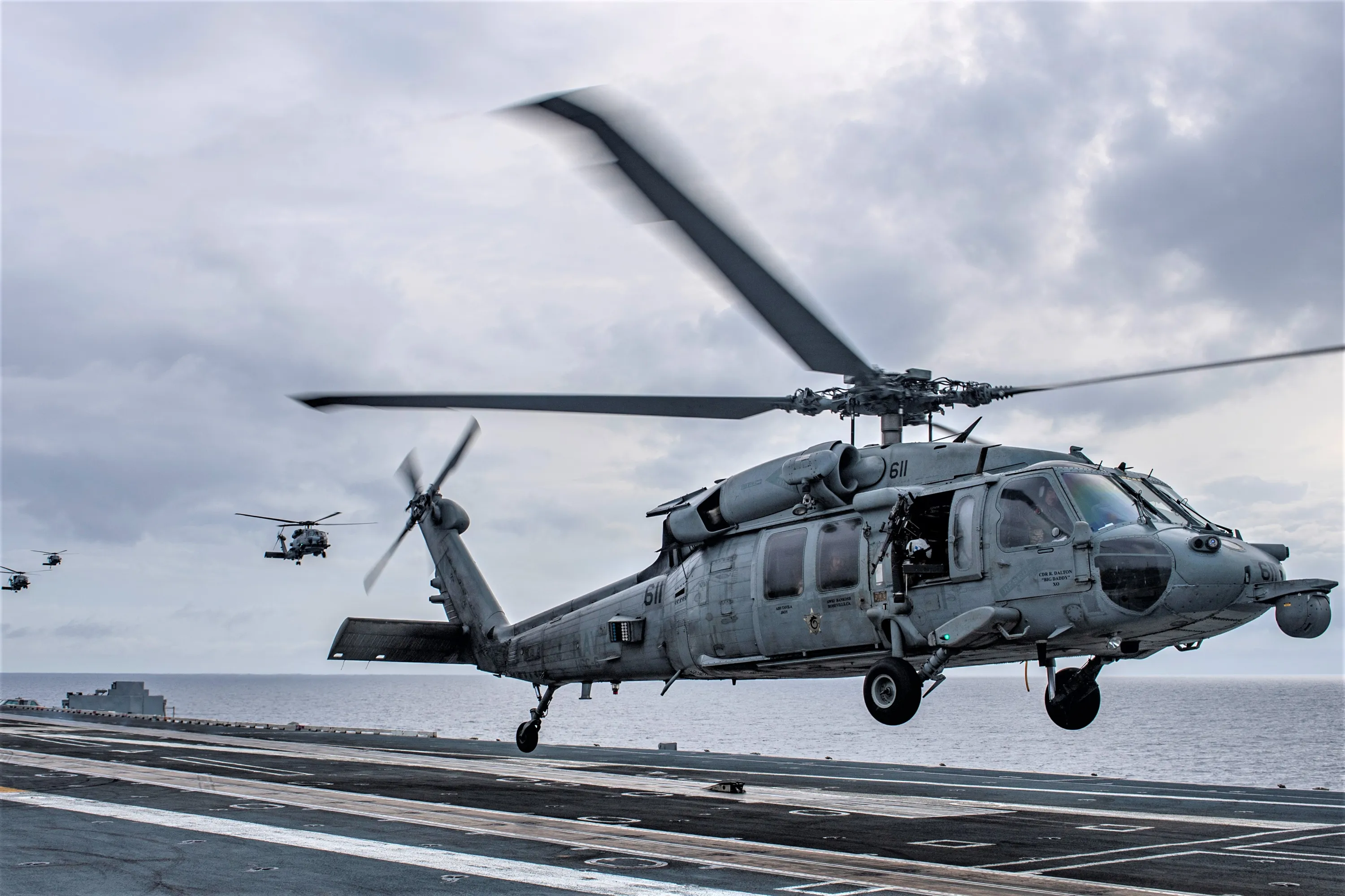 An MH-60S Sea Hawk helicopter lands aboard the aircraft carrier USS Nimitz in the South China Sea, Sunday, February 12, 2023, as Nimitz in U.S. 7th Fleet was conducting operations. The 7th Fleet based in Japan said Sunday that the USS Nimitz aircraft carrier strike group and the 13th Marine Expeditionary Unit have been conducting “integrated expeditionary strike force operations” in the South China Sea. (Photo by Mass Communication Specialist 3rd Class Joseph Calabrese/U.S. Navy via AP Photo)