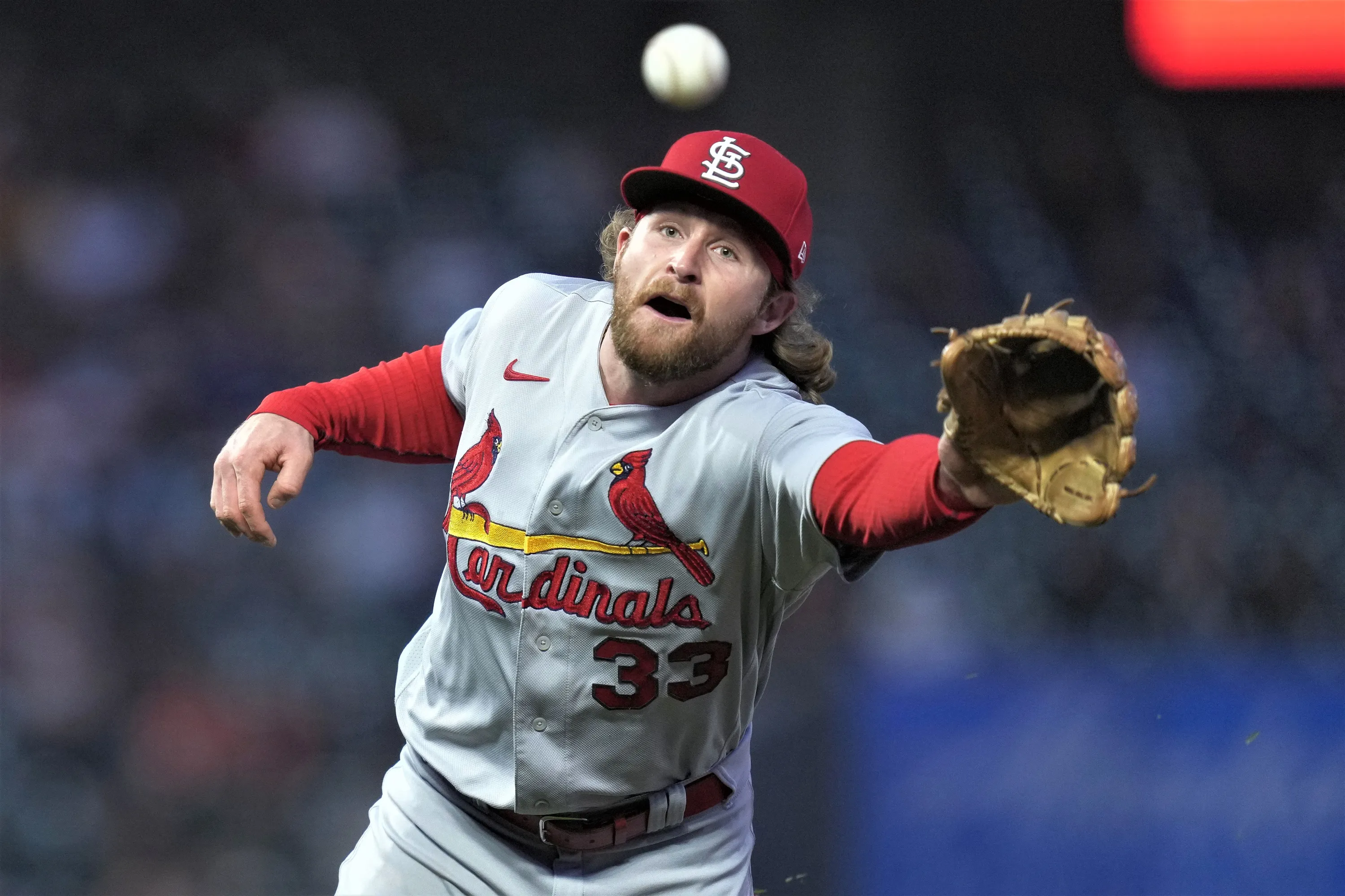 St. Louis Cardinals second baseman Brendan Donovan tosses the ball to first for an out on San Francisco Giants' Michael Conforto during the fourth inning of a baseball game in San Francisco, Wednesday, April 26, 2023. (Photo by Godofredo A. Vásquez/AP Photo)