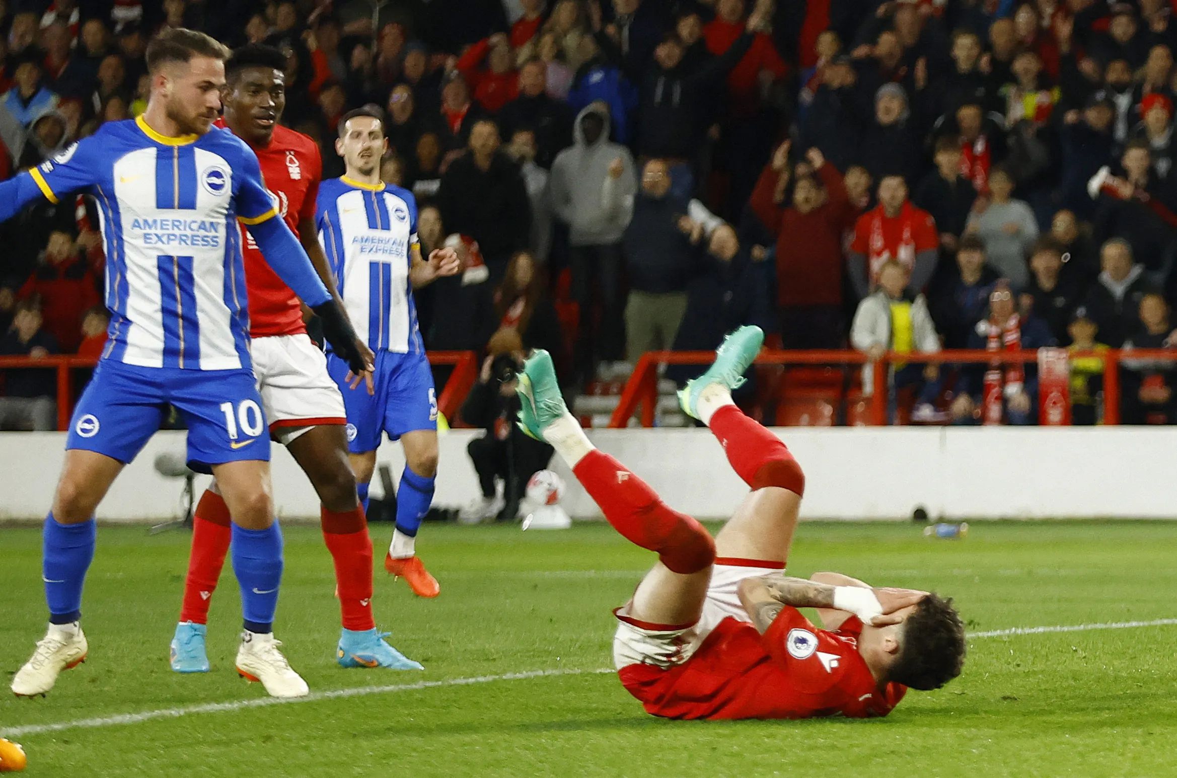Neco Williams of Nottingham Forest goes down with an injury during the Premier League match between Nottingham Forest and Brighton & Hove Albion at City Ground on April 26, 2023 in Nottingham, England. (Photo by Andrew Boyers/Action Images via Reuters)