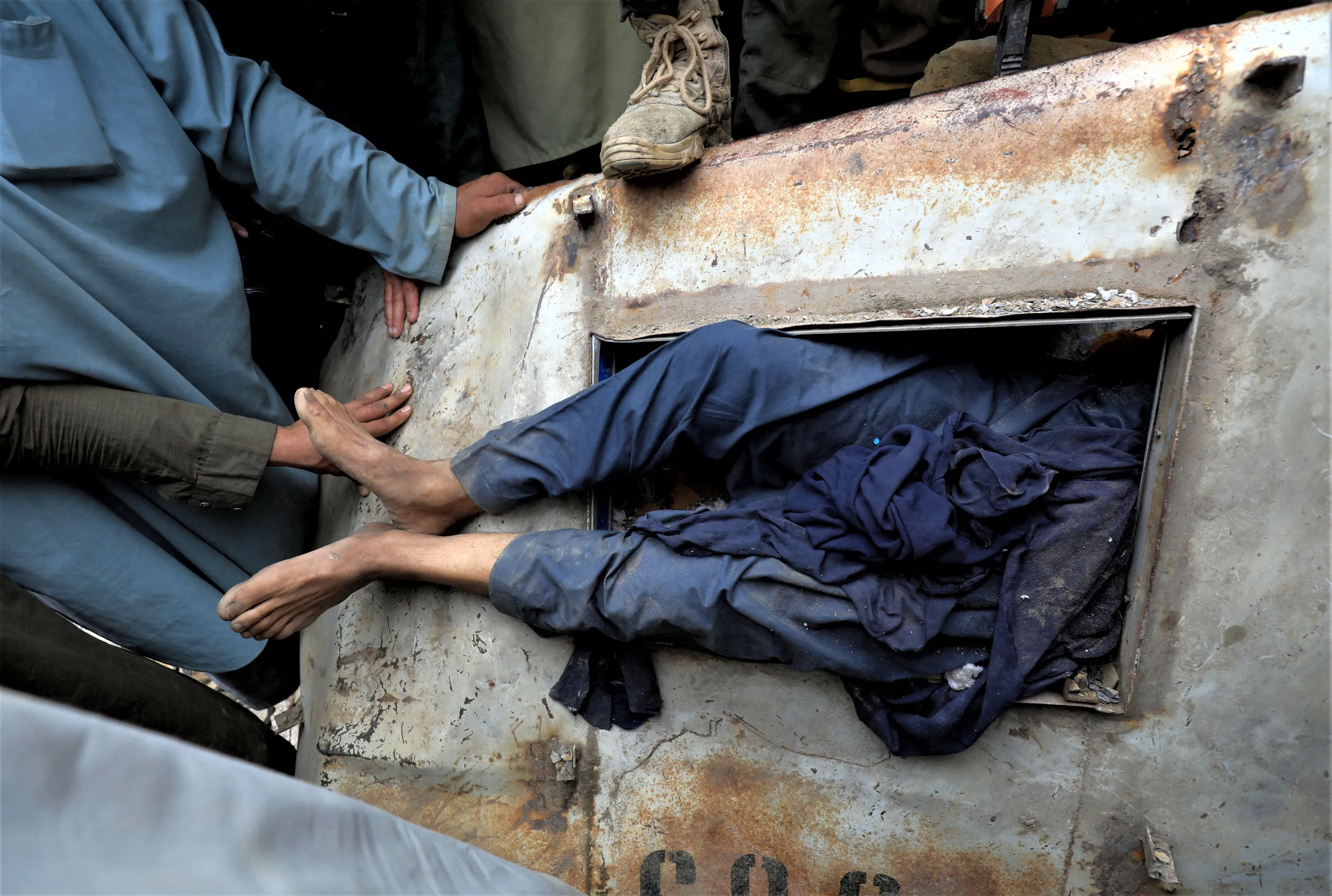 The body of a victim is seen trapped in a damaged vehicle after a landslide close to the Torkham border in Pakistan on April 18, 2023. (Photo by Fayaz Aziz/Reuters)