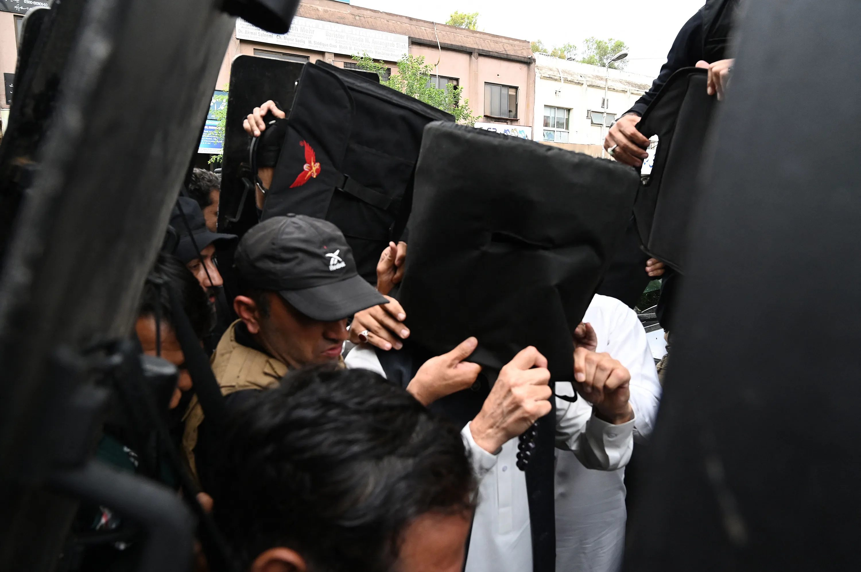 Security personnel use bullet proof shields to protect Pakistan's former Prime Minister Imran Khan (C) as he arrives to appear at the Islamabad high court in Islamabad on April 28, 2023. The Islamabad high court granted a protective bail to Imran Khan until May 3 in a mutiny case. (Photo by Aamir Qureshi/AFP Photo)