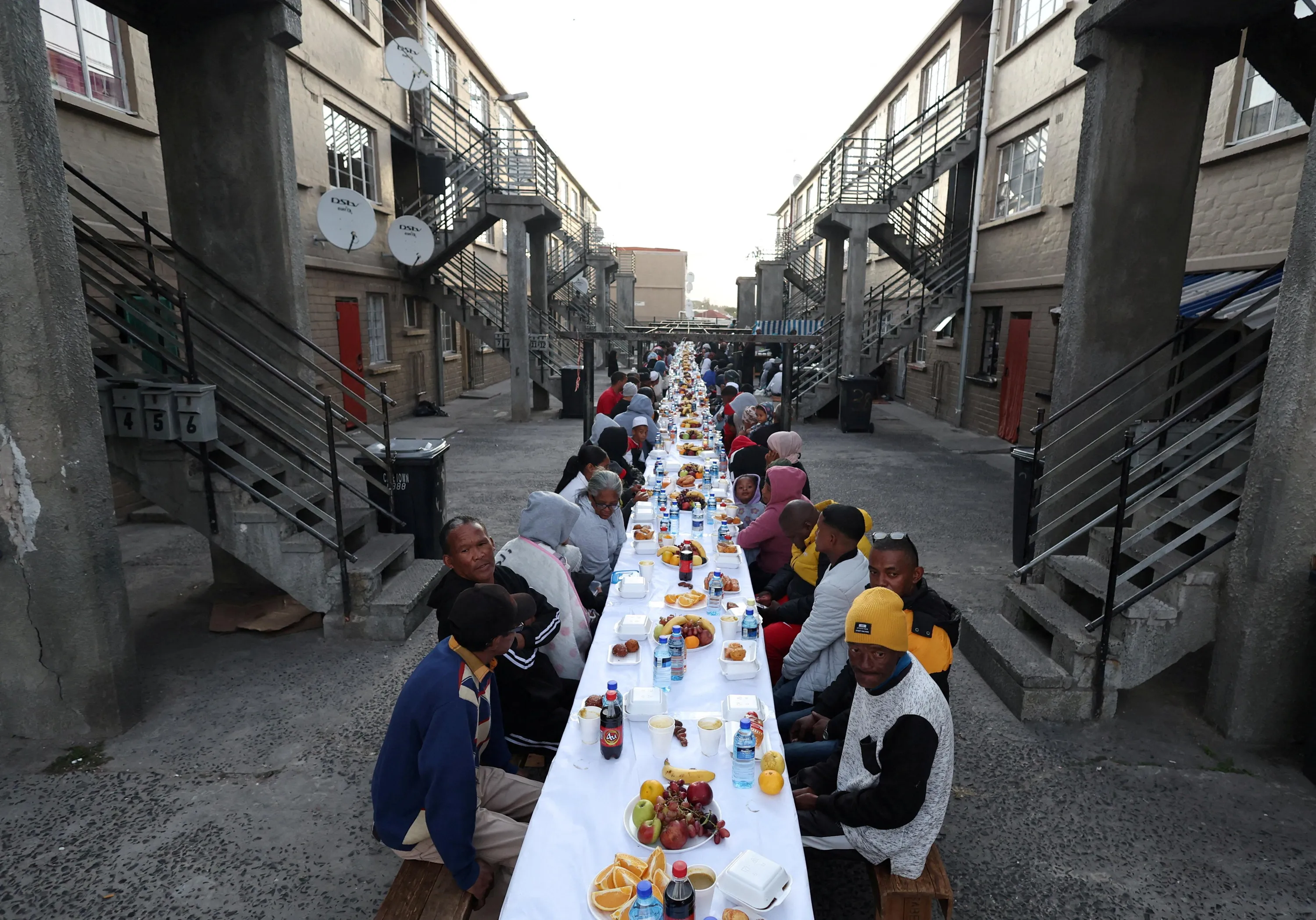 People sit at a long makeshift table before an Iftar, breaking of the fast, during the holy month of Ramadan in Heideveld on the Cape Flats, Cape Town, South Africa on April 15, 2023. (Photo by Esa Alexander/Reuters)