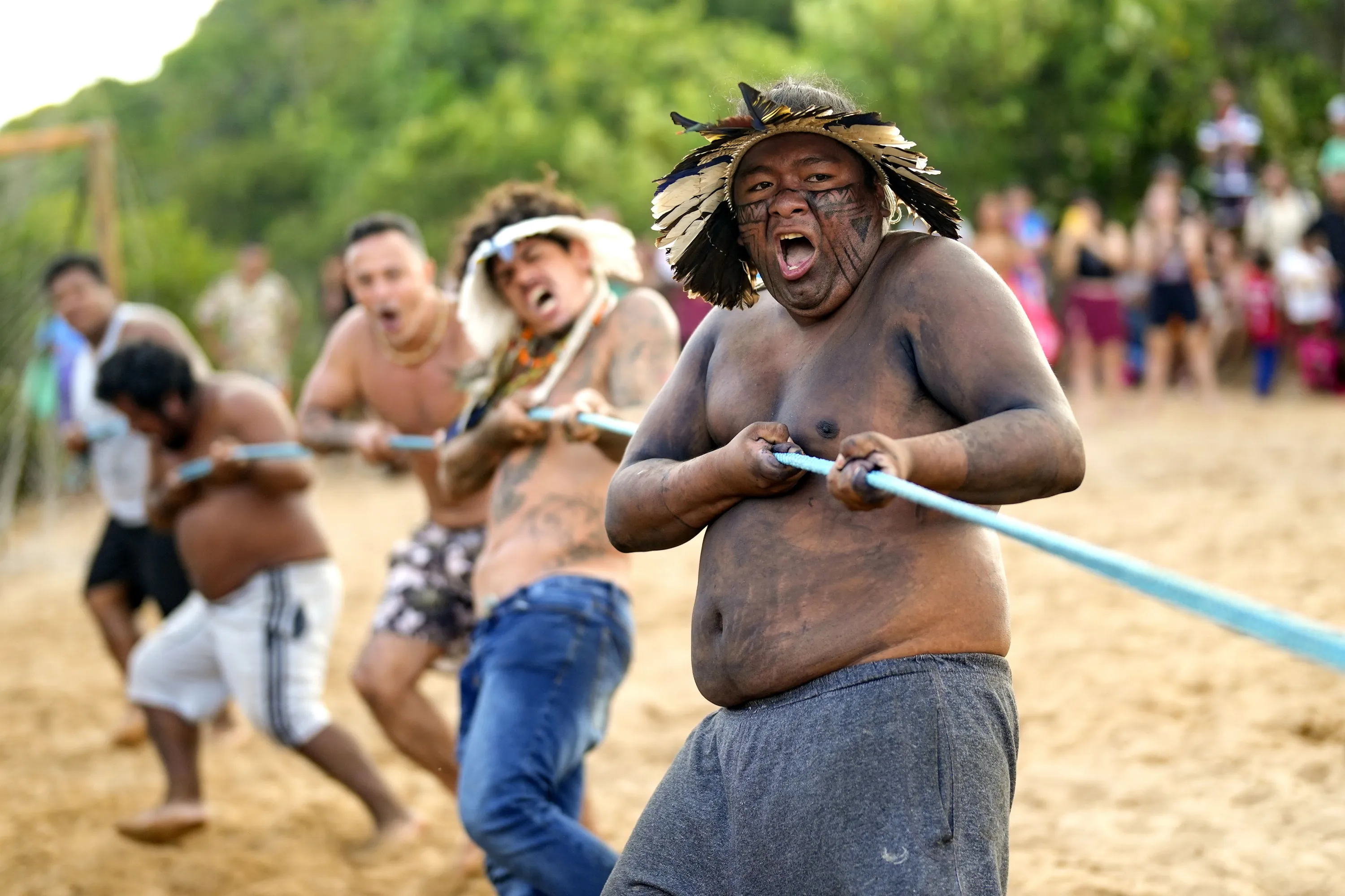 Athletes compete in a tug-of-war event during the Indigenous Games, in the Tapirema community of Peruibe, Brazil, Saturday, April 22, 2023. Hundreds of Indigenous athletes gather this weekend in the south of Sao Paulo state to hold their version of the Olympic Games. They will compete for medals in archery, tug of war, athletics, Indigenous wrestling and other sports. (Photo by Andre Penner/AP Photo)