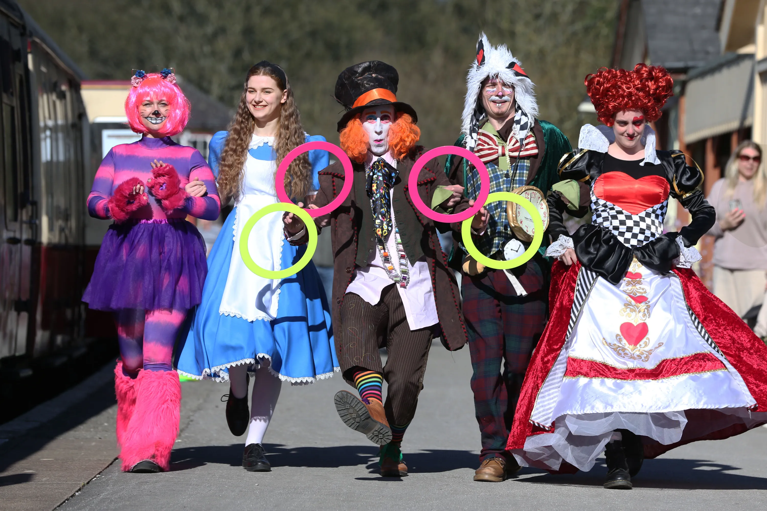 Picture shows members of Pure Entertainment, dressed as characters from Alice in Wonderland, on the platform at Bolton Abbey station in North Yorkshire on April 7, 2023. The heritage line runs for four miles, and was part of the former Skipton to Ilkley line which was closed down by British Railways in 1965. (Photo by Lorne Campbell/Guzelian)
