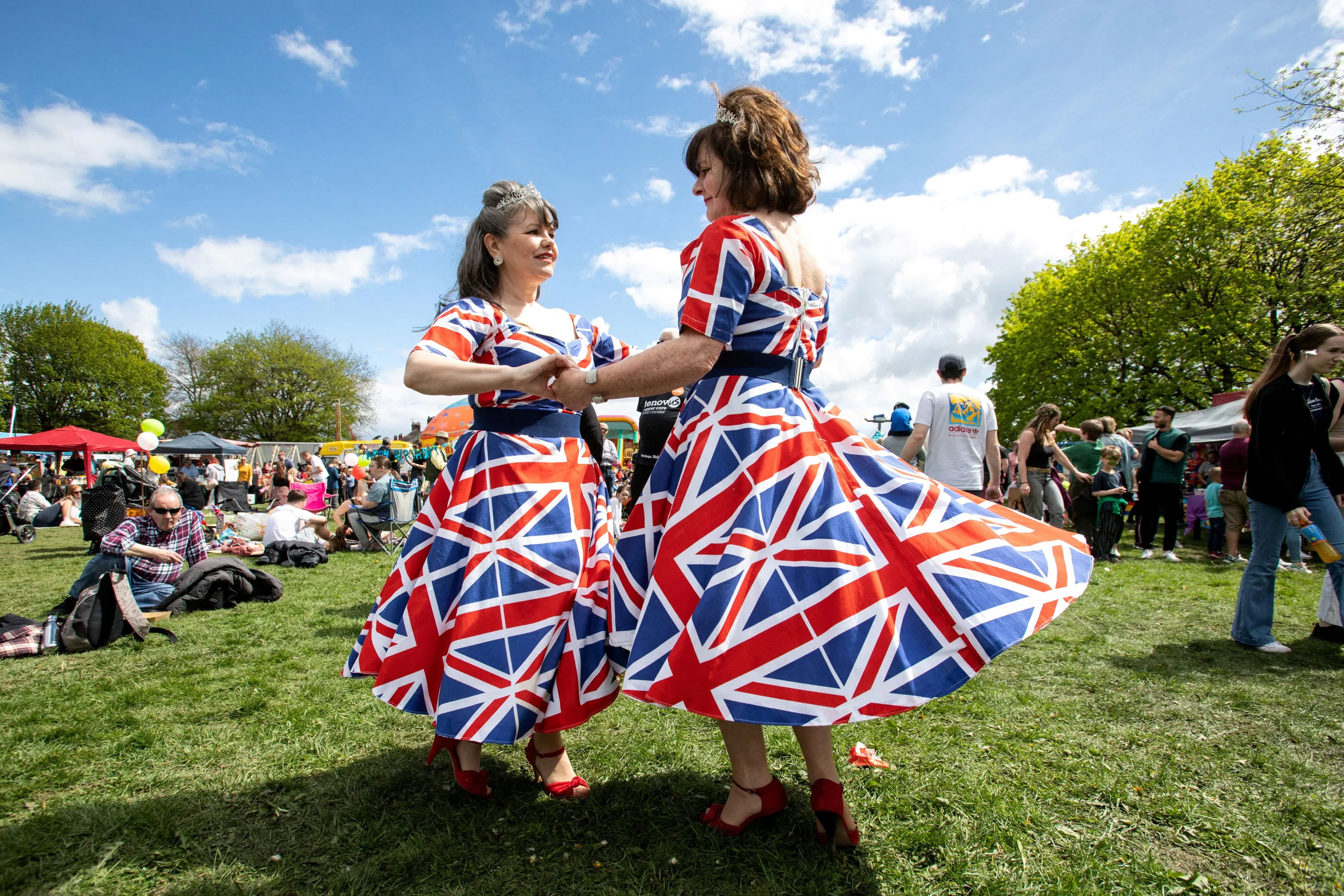 Laura Bridgewater and Joan Hoctor from the band “Gentlemen Prefer Blondes” entertain the crowds at the 10th Calon Hearts, Cardiff Carnival, Wales, Britain on May 1, 2023. This years charity event is to celebrate the coming coronation of King Charles. (Photo by Joann Randles/Reuters)