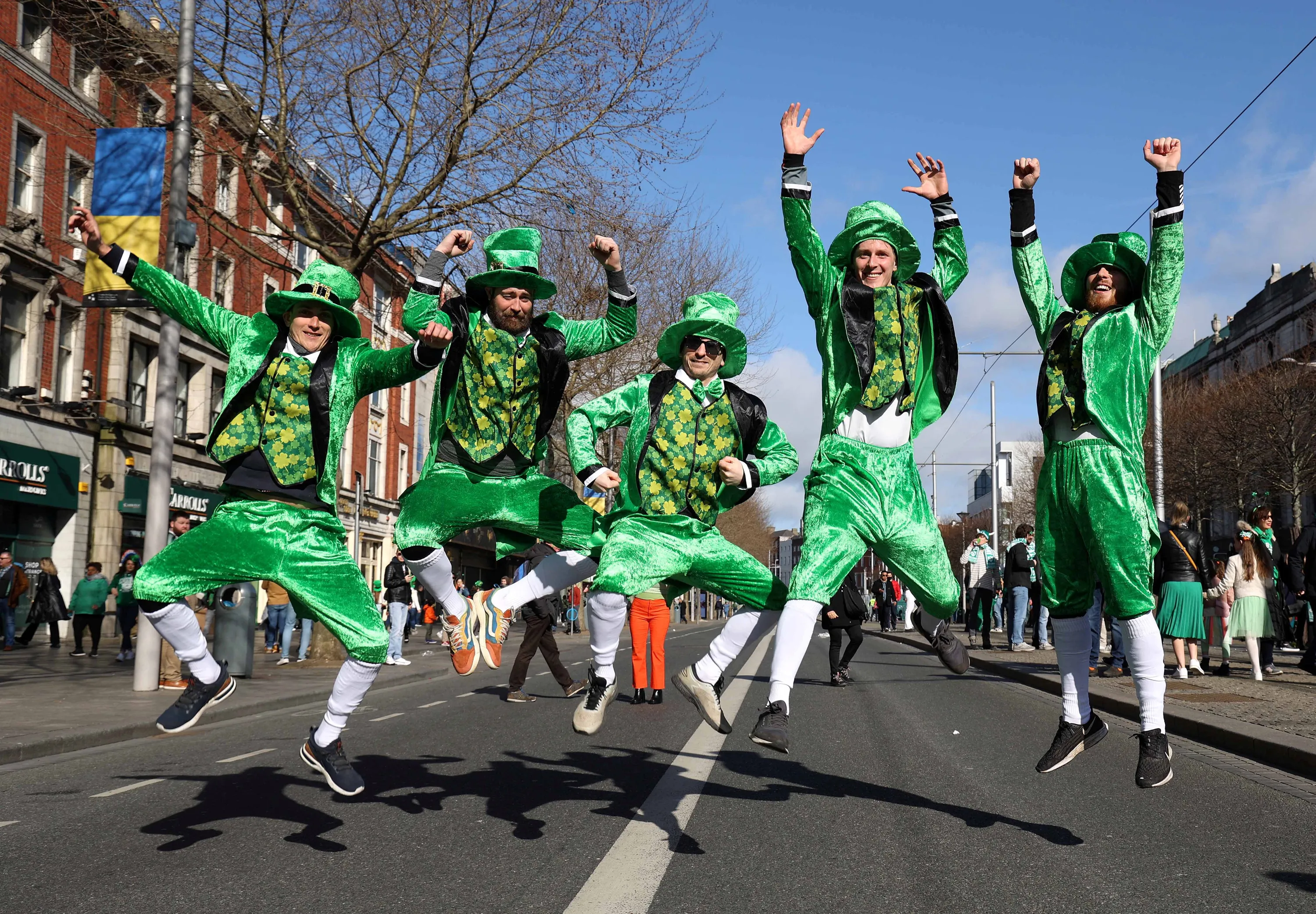 Revellers from Denmark dressed in green pose photo during the the annual St Patrick's Day parade in Dublin on March 17, 2022. (Photo by Damien Eagers/AFP Photo)