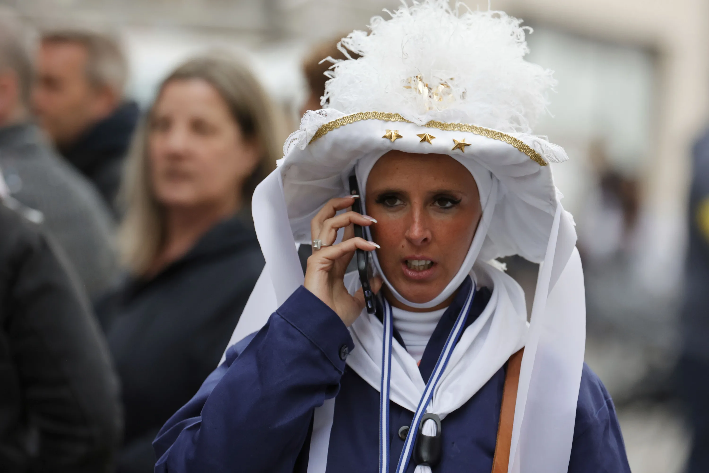 A performer speaks on a phone, after an incident at a carnival, in Strepy-Bracquenies, Belgium, Sunday, March 20, 2022. A car slammed at high speed into carnival revelers in a small town in southern Belgium, killing six people and leaving 10 more with life threatening injuries. (Photo by Olivier Matthys/AP Photo)