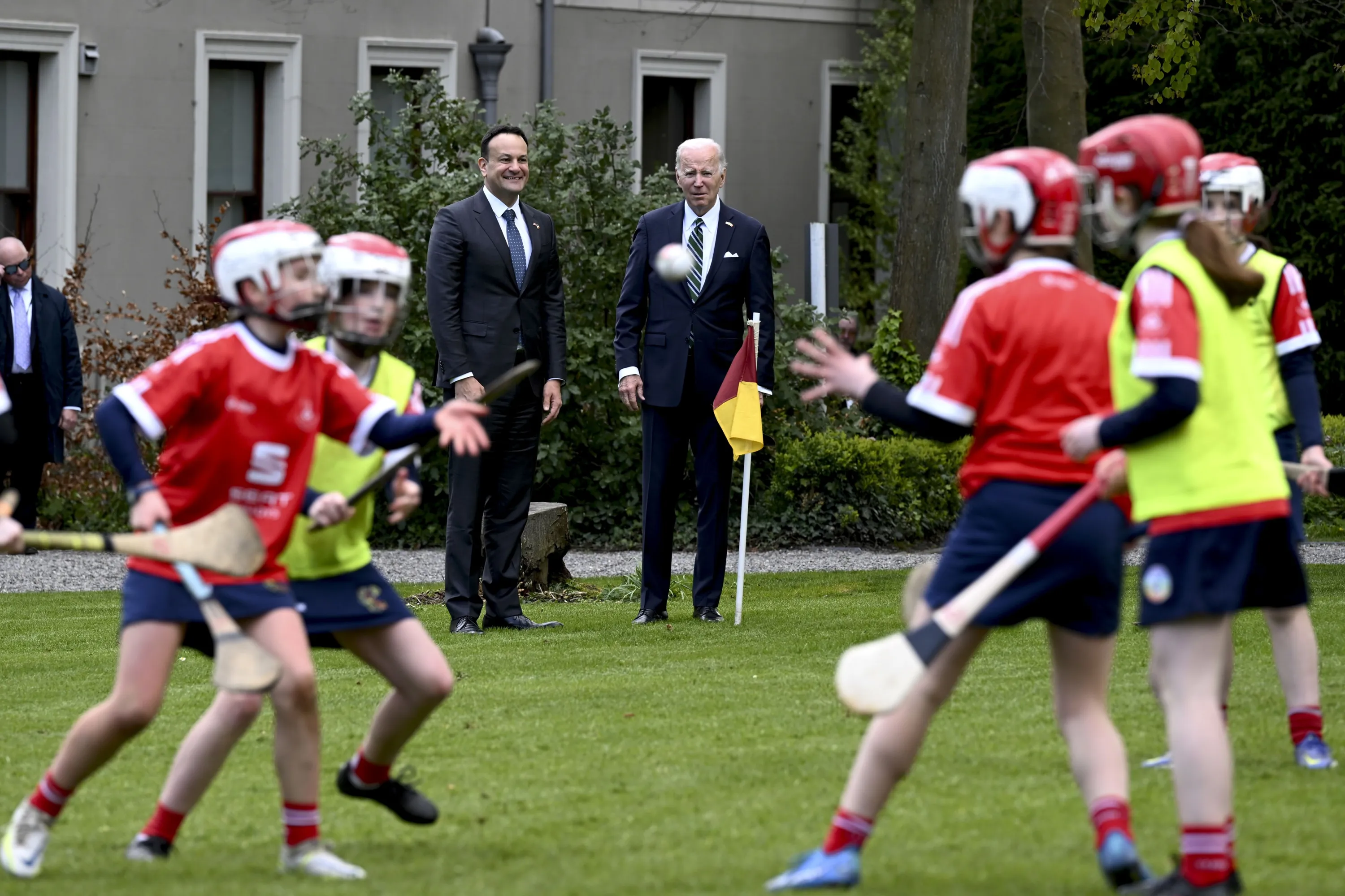 President Joe Biden and Taoiseach Leo Varadkar of Ireland watch as girls play hurling during a youth Gaelic sports demonstration at Farmleigh House in Dublin, April 13, 2023. (Photo by Kenny Holston/The New York Times)