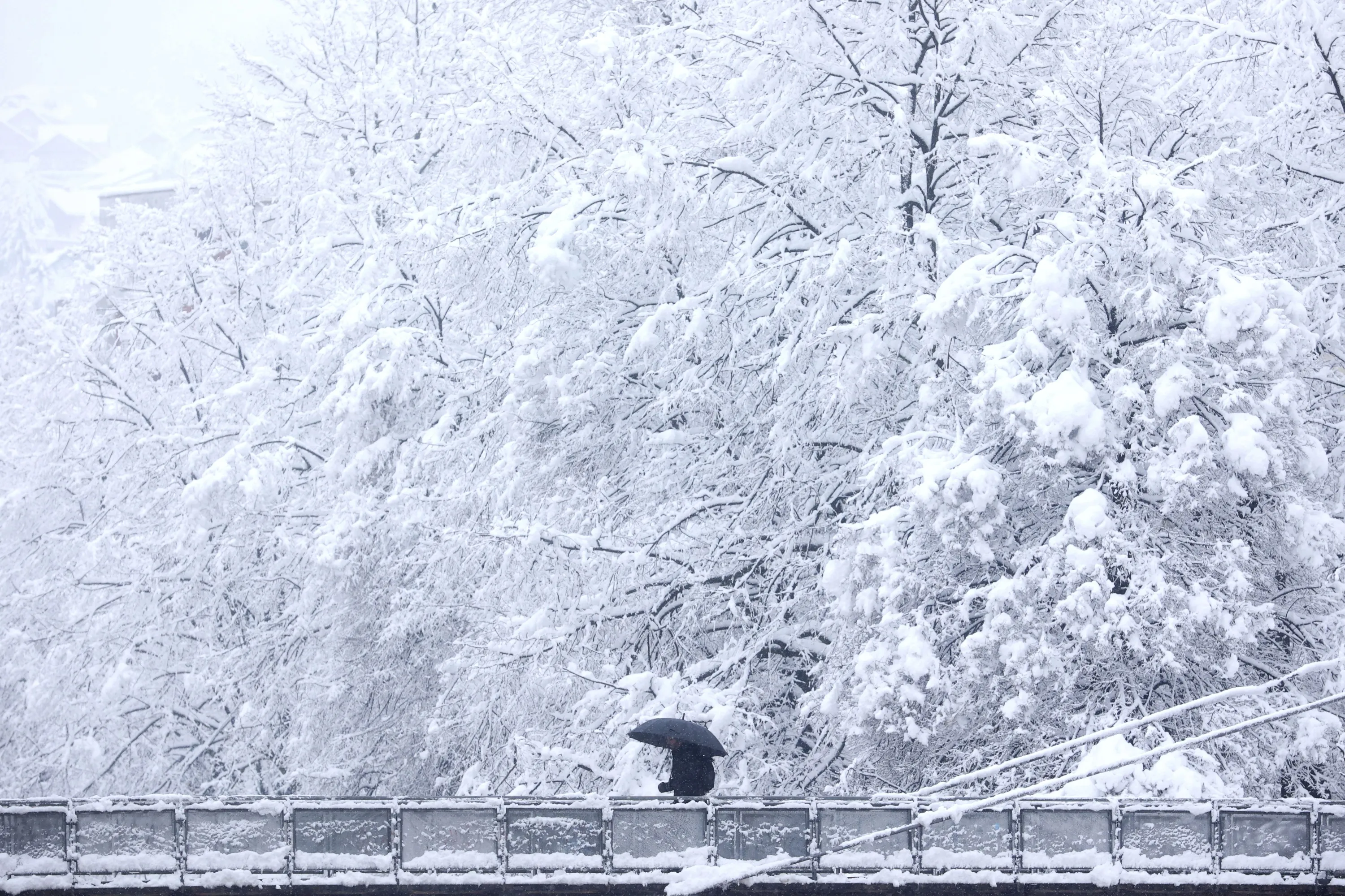 A man carrying an umbrella, crosses a bridge during heavy snowfall in Sarajevo, Bosnia, Monday, February 27, 2023. (Photo by Armin Durgut/AP Photo)