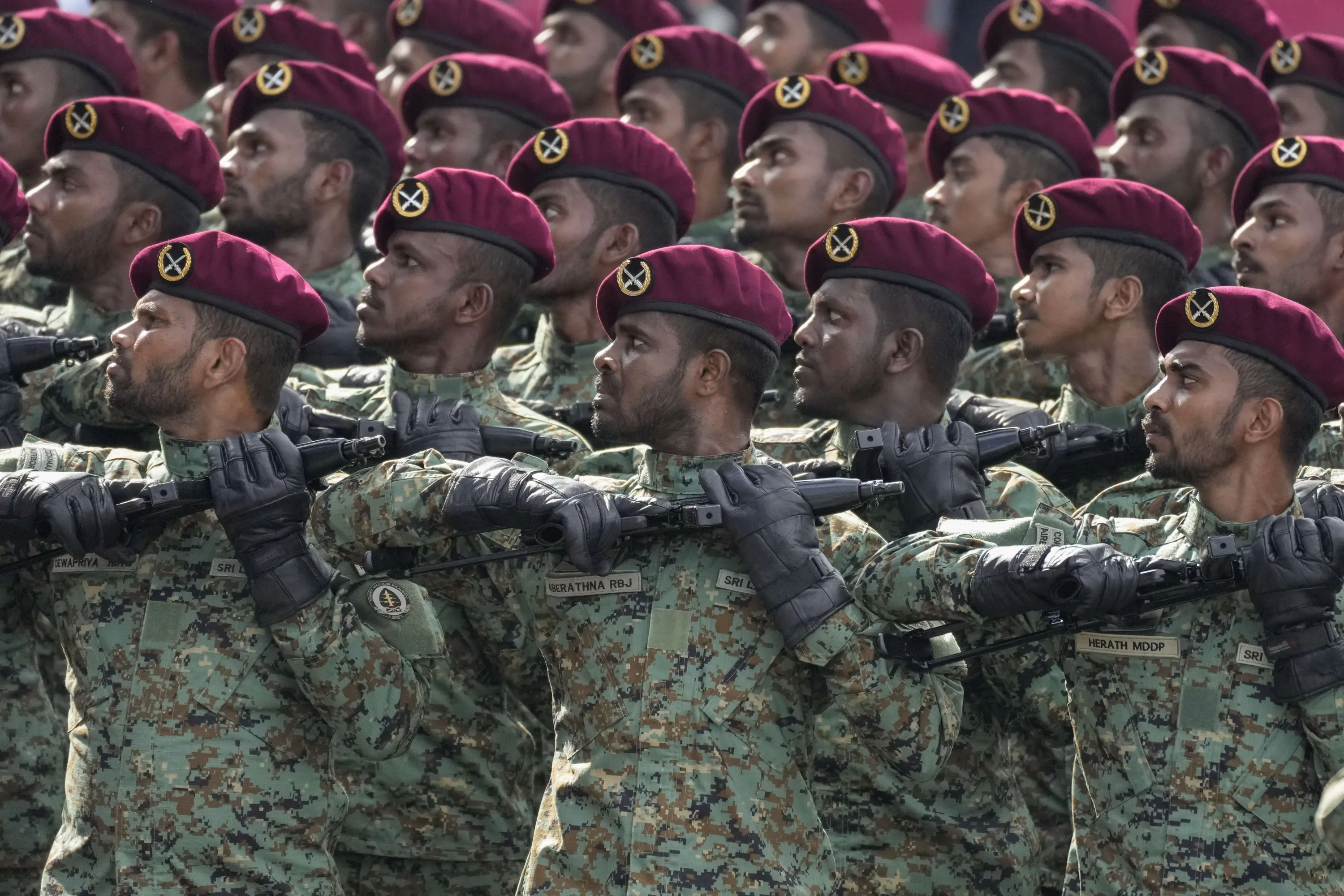 Sri Lanka army commando regiment soldiers march during the 75th Independence Day ceremony in Colombo, Sri Lanka, Saturday, February 4, 2023. (Photo by Eranga Jayawardena/AP Photo)
