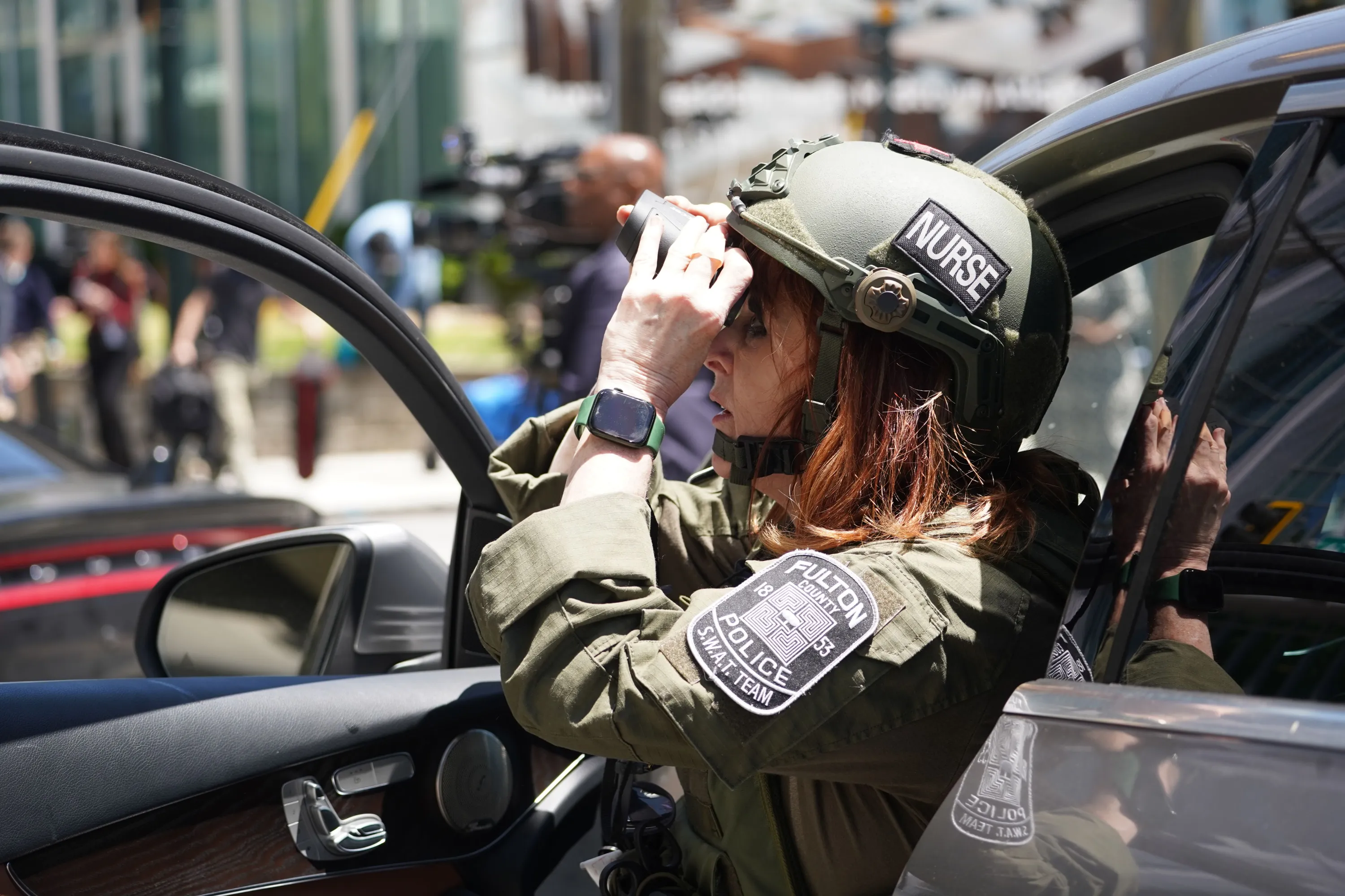 A nurse with the Fulton County police SWAT team works at the scene of a shooting near a medical facility on May 3, 2023 in Atlanta, Georgia. Police say four people were injured and one killed in the shooting and the suspect is still at large. (Photo by Megan Varner/Getty Images)