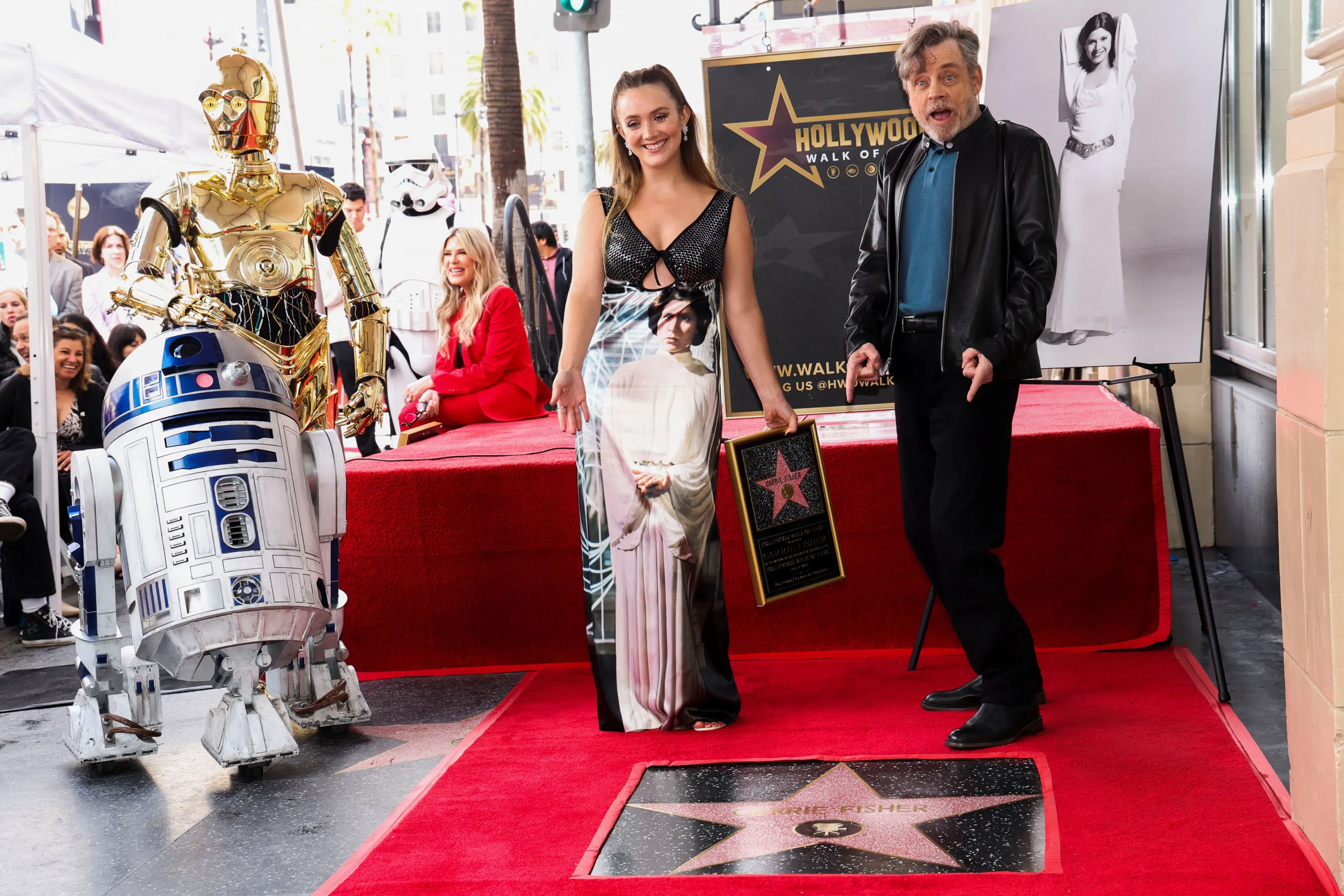 Billie Lourd and Mark Hamill pose along Star Wars characters C-3PO and R2-D2 next to the star of actor Carrie Fisher during its posthumous unveiling ceremony on the Hollywood Walk of Fame in Los Angeles, California, U.S., May 4, 2023. (Photo by Mario Anzuoni/Reuters)