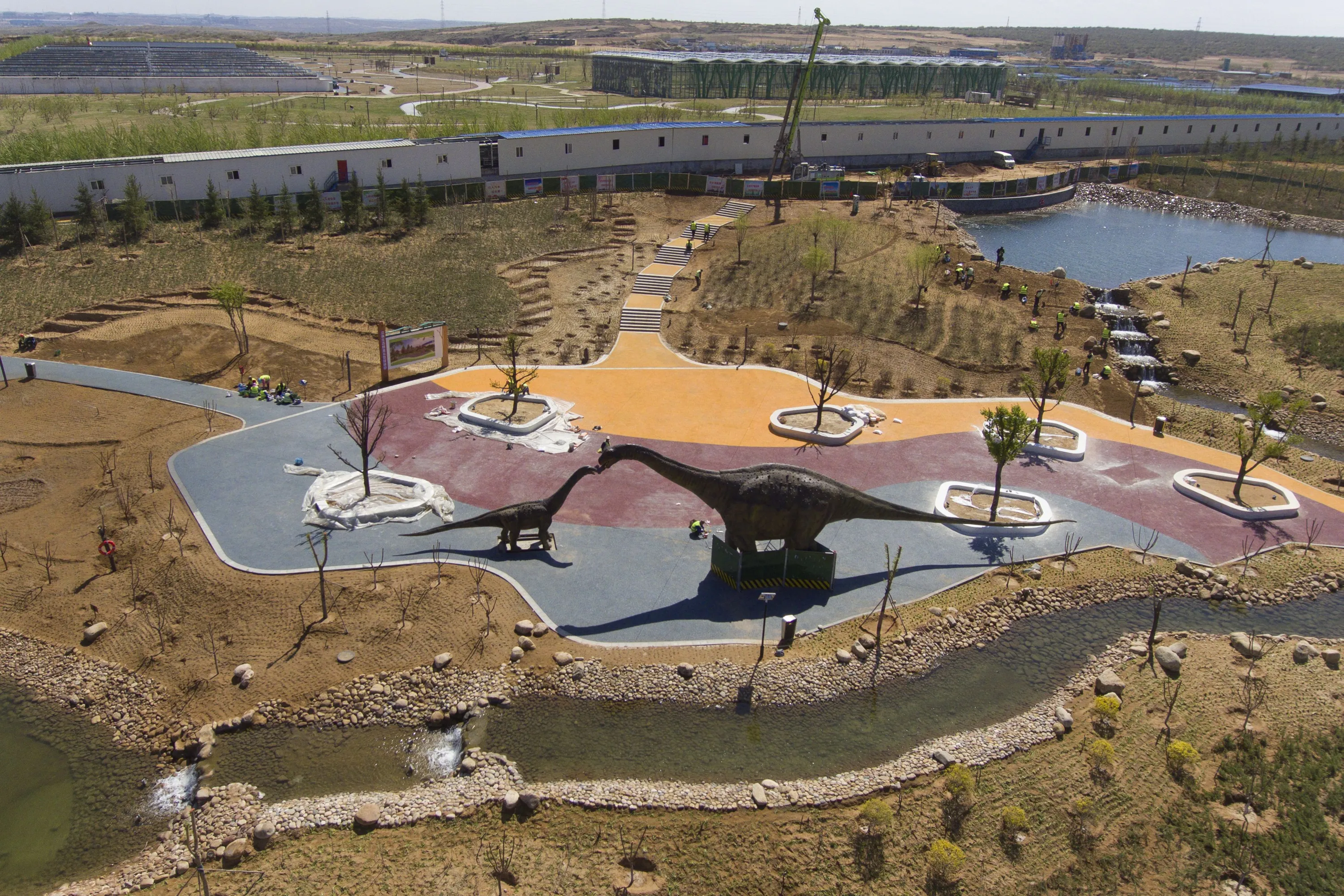 An aerial view of a Ecological Restoration Demonstration Park depicting dinosaurs is seen near the Hongliulin Coal Mine complex near the city of Shenmu in northwestern China's Shaanxi province on Tuesday, April 25, 2023. (Photo by Ng Han Guan/AP Photo)