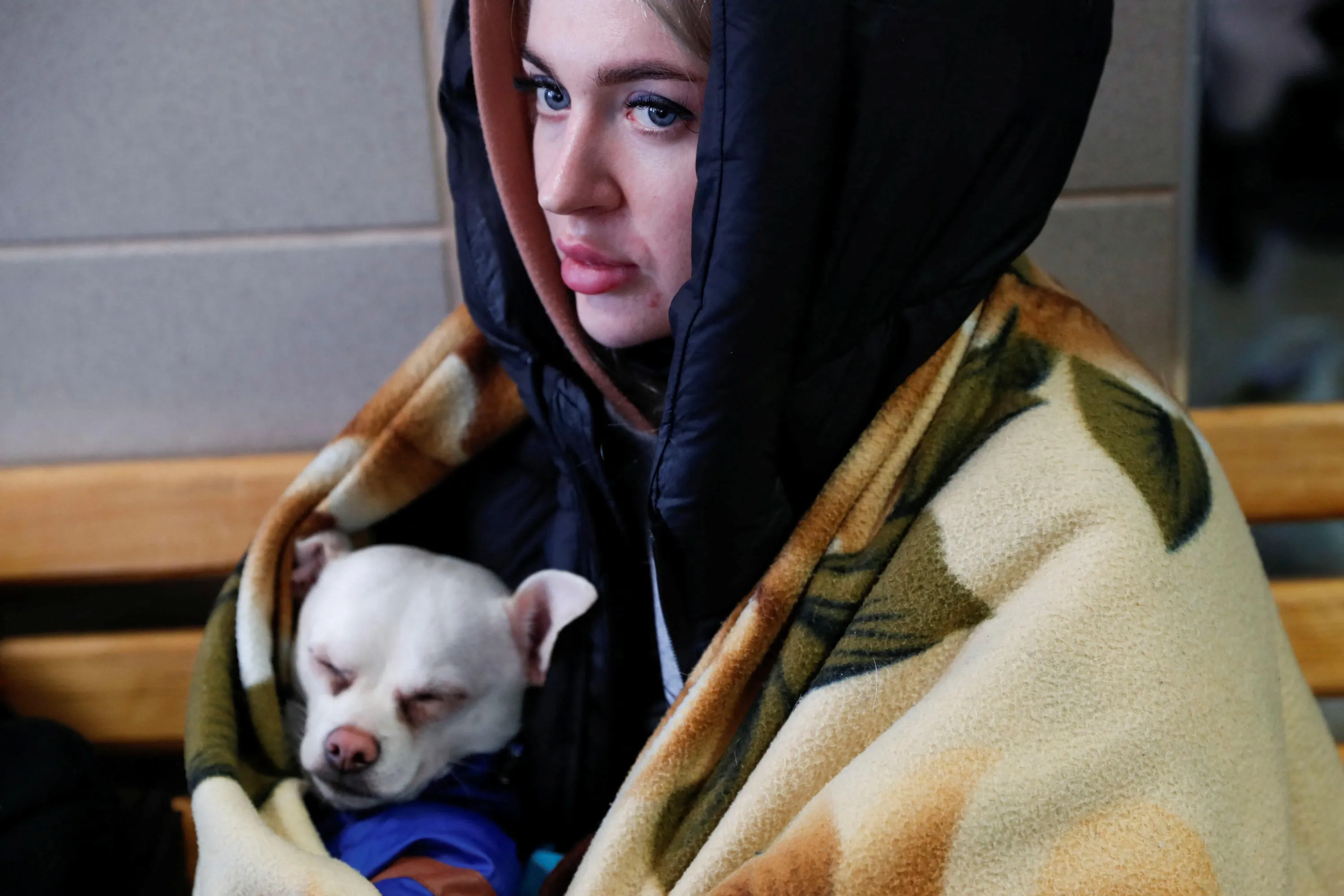 A woman fleeing Russia's invasion of Ukraine rests at the train station with her dog in Zahony, Hungary on March 4, 2022. (Photo by Bernadett Szabo/Reuters)