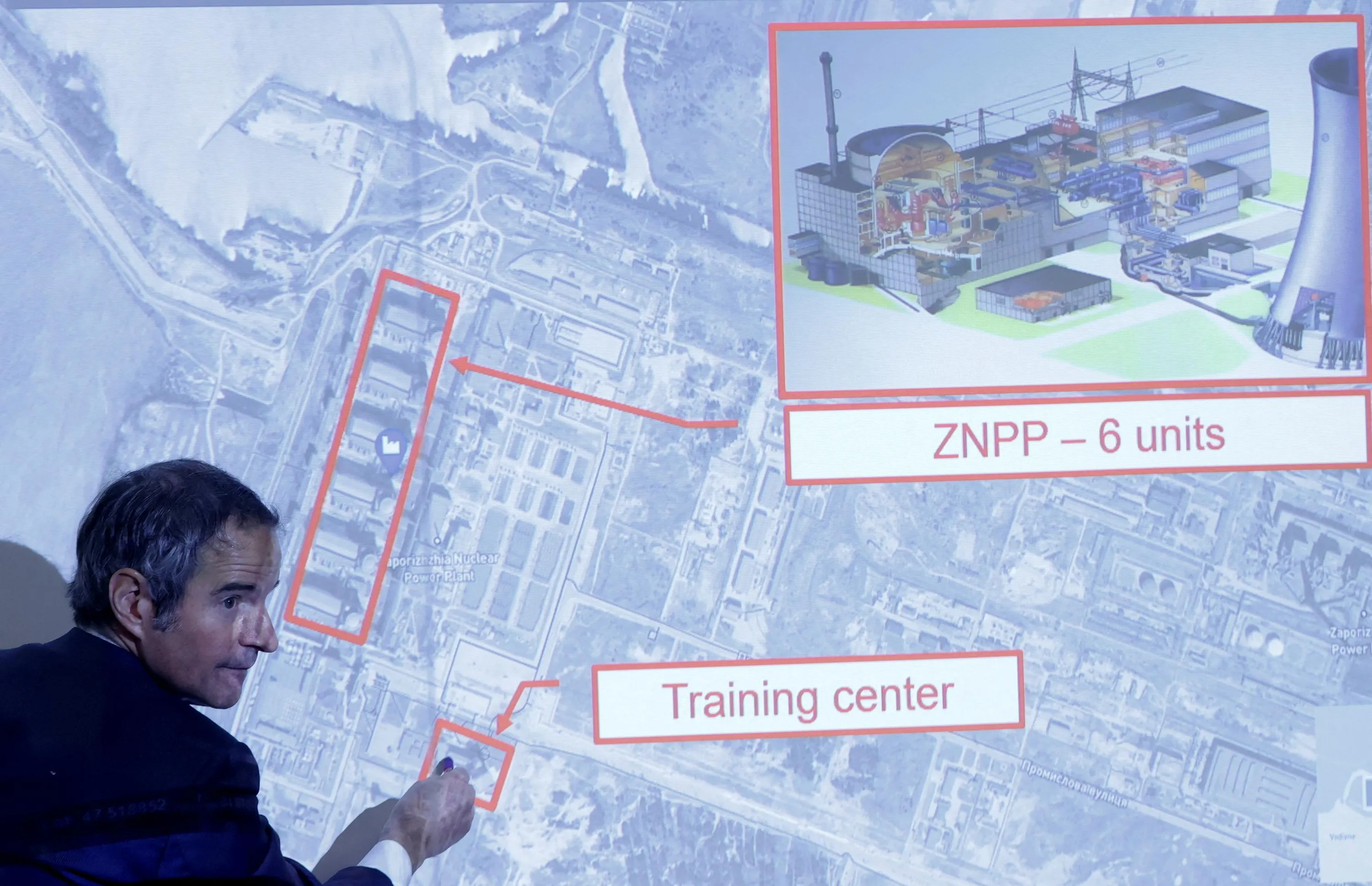 International Atomic Energy Agency (IAEA) Director General Rafael Grossi points on a map of a Ukrainian power plant during a news conference in Vienna, Austria on March 4, 2022. (Photo by Leonhard Foeger/Reuters)