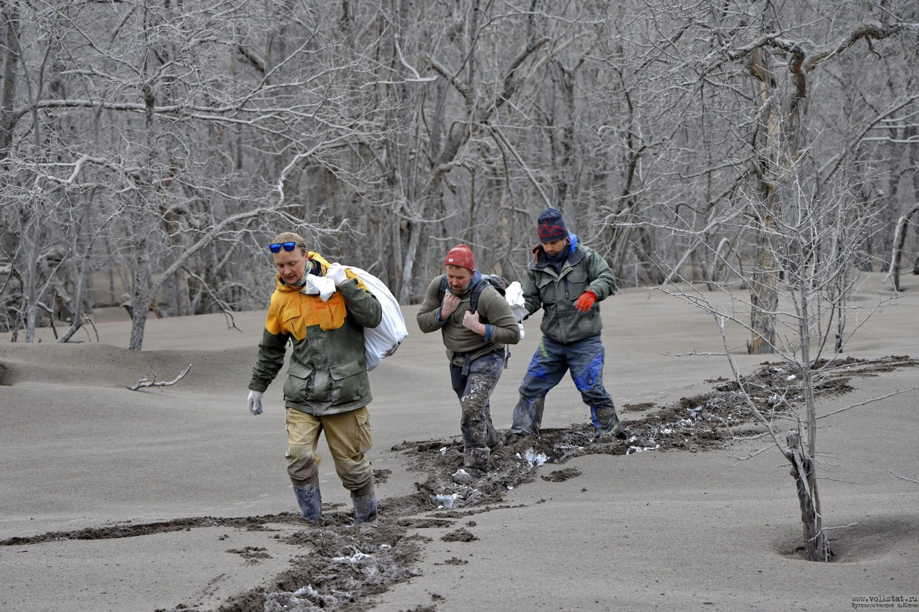 In this photo provided by the Russian Academy of Sciences' Volcanology Institute, a group of volcanologists walk on volcanic ash covers the ground after the Shiveluch volcano's eruption in Klyuchi village on the Kamchatka Peninsula in Russia, Thursday, April 13, 2023. Shiveluch, one of Kamchatka Peninsula's most active volcanoes, started erupting early Tuesday, spewing ash more than 300 miles (500 kilometers) northwest. Several Russian villages were covered in grey volcanic dust in the largest fallout in nearly 60 years. (Photo by Yury Demyanchuk/Russian Academy of Sciences' Volcanology Institute via AP Photo)