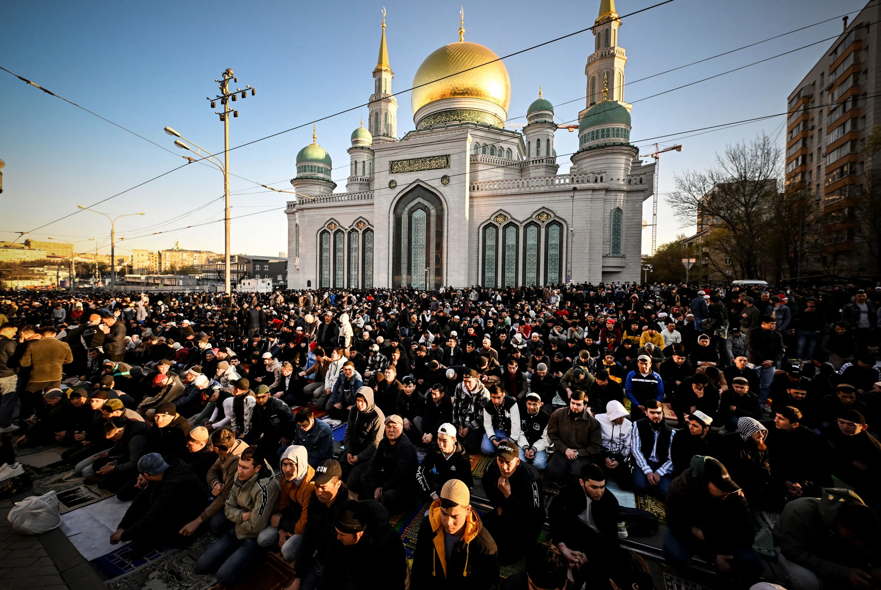 Muslims pray on the first day of Eid al-Fitr, which marks the end of the holy fasting month of Ramadan, outside the Central Mosque in Moscow on April 21, 2023. (Photo by Alexander Nemenov/AFP Photo)