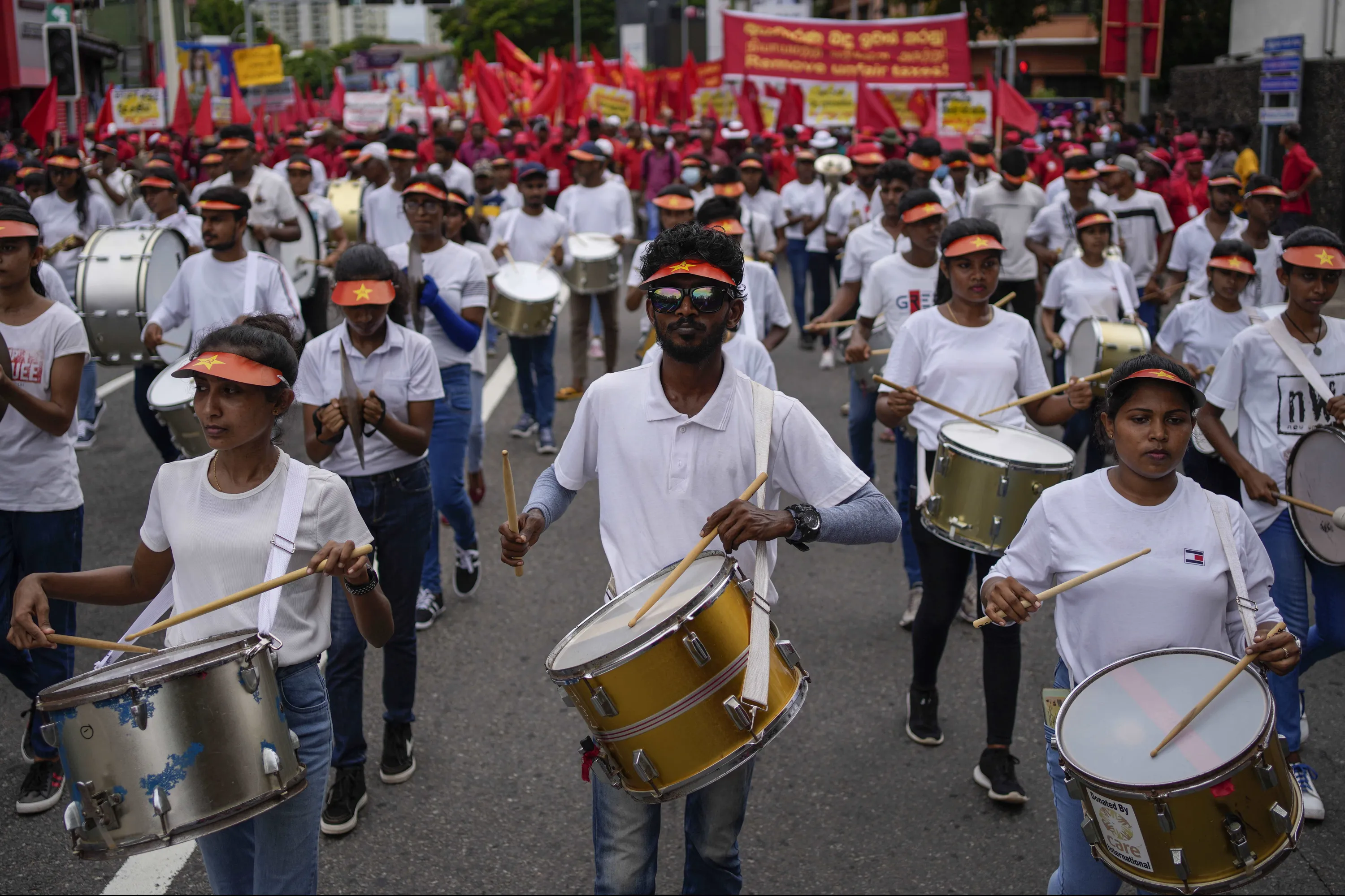 Members of the People's Liberation Front, a marxist political party, beat drums as they participate in a rally to mark May Day in Colombo, Sri Lanka, Monday, May 1, 2023. (Photo by Eranga Jayawardena/AP Photo)