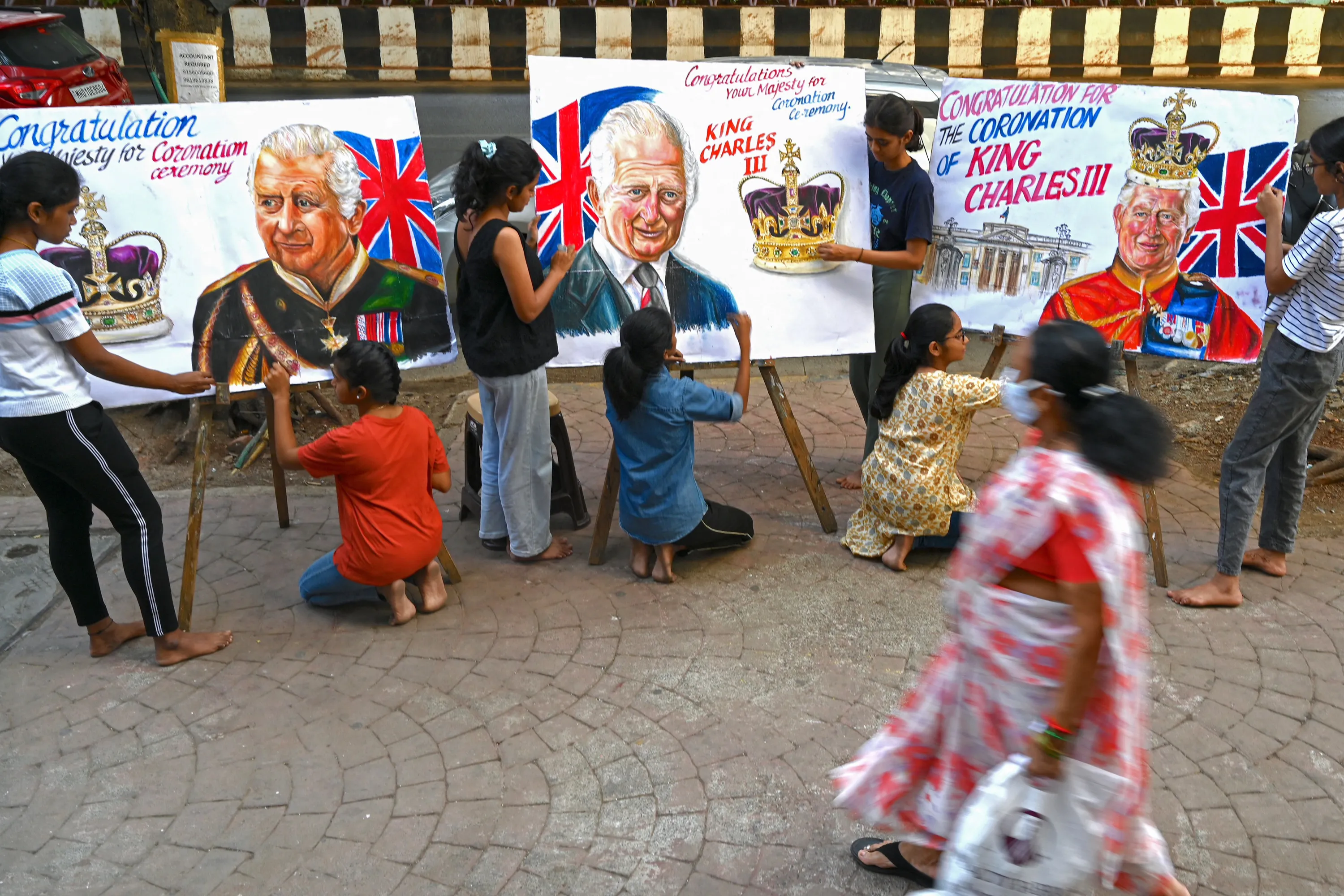 Art school students give final touches to paintings depicting Britain's King Charles III ahead of his coronation, in Mumbai on May 5, 2023. King Charles III will be crowned alongside wife Camilla on May 6, in a centuries-old ceremony with celebrations marked by pomp and pageantry. (Photo by Indranil Mukherjee/AFP Photo)