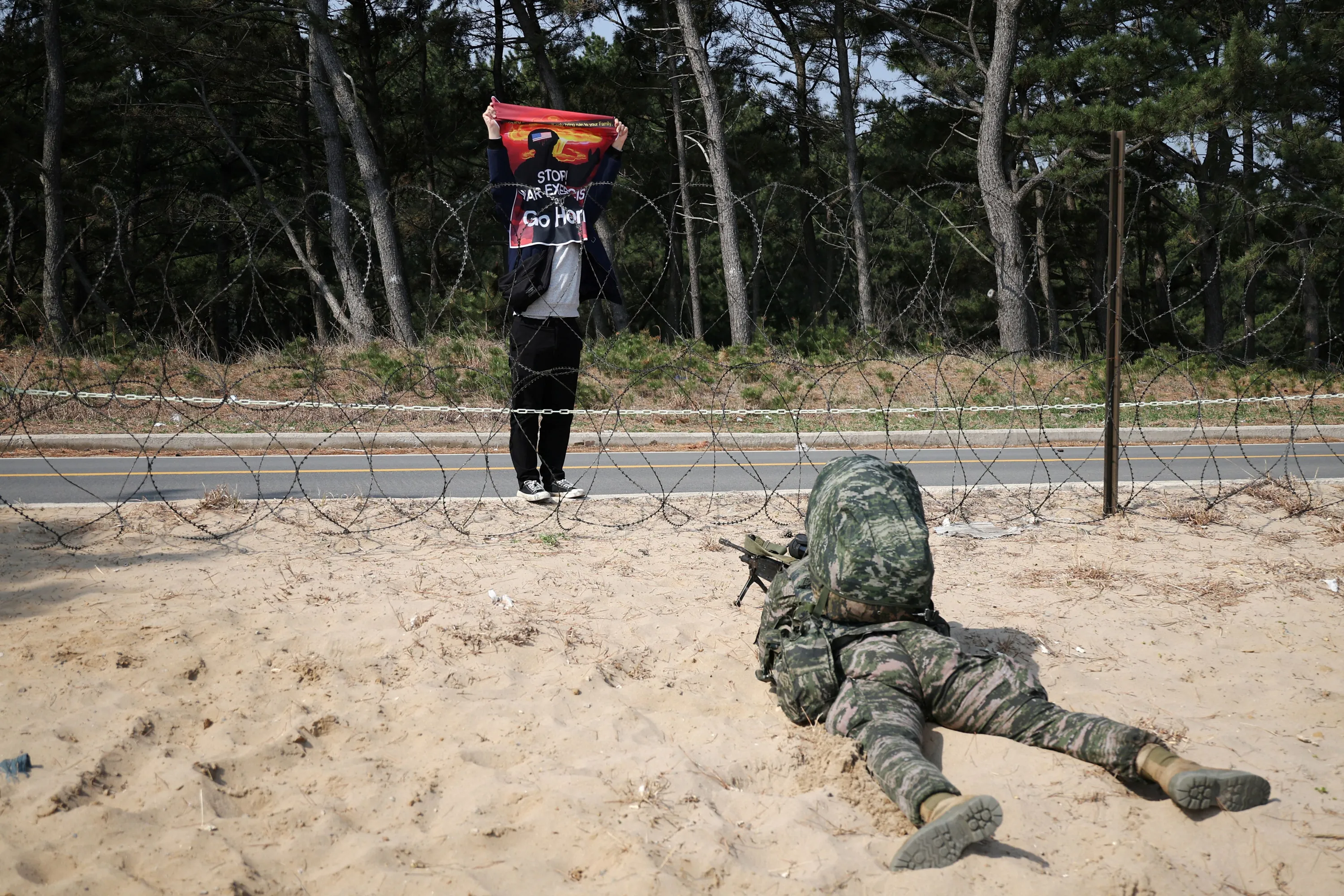 An anti-war activist holds up a sign “Stop war exercise, Go home” in front of a South Korean marine taking a position during a U.S and South Korea marine corps combined amphibious landing drill called the “Ssangyong” exercise, in Pohang, South Korea on March 29, 2023. (Photo by Kim Hong-Ji/Reuters)