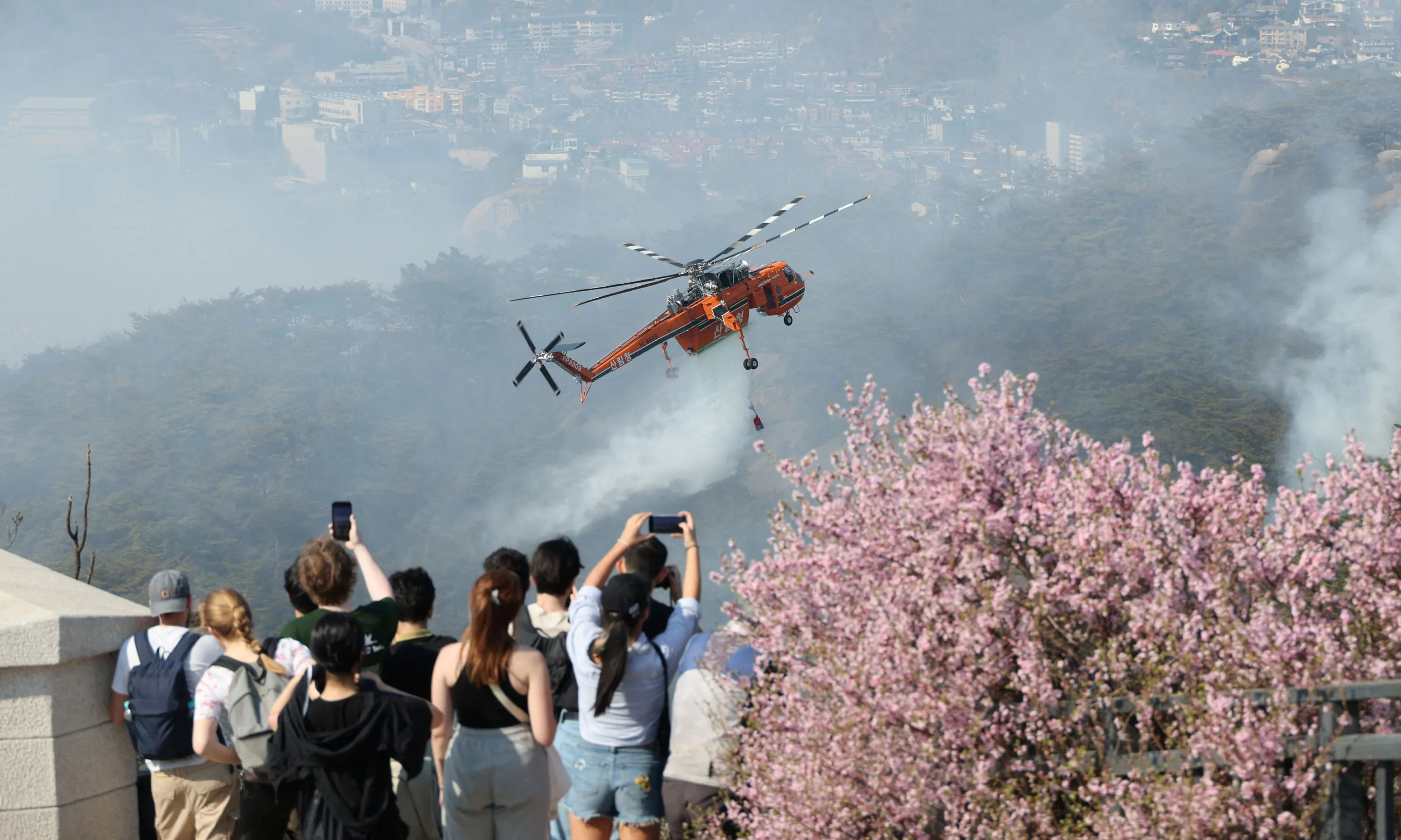 This picture taken on April 2, 2023 shows people watching as a helicopter douses a wildfire on Mount Inwang in Seoul. (Photo by Yonhap via AFP Photo)
