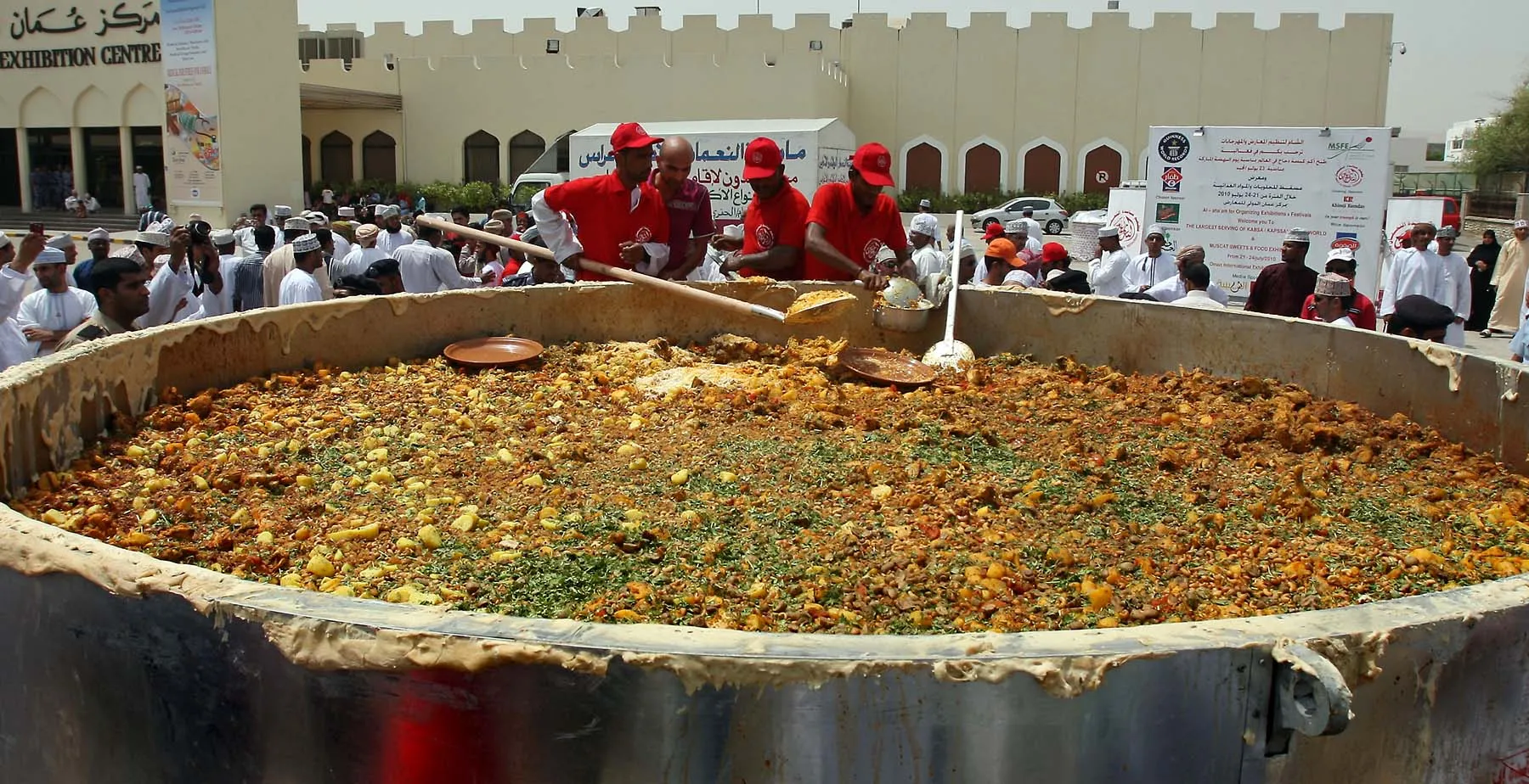 Omani men stir ingredients in a large pot as they prepare a traditional “Kabsa” dish in an attempt to set a new Guinness world record in Muscat on July 23, 2010. (Photo by Mohammed Mahjoub/AFP Photo)