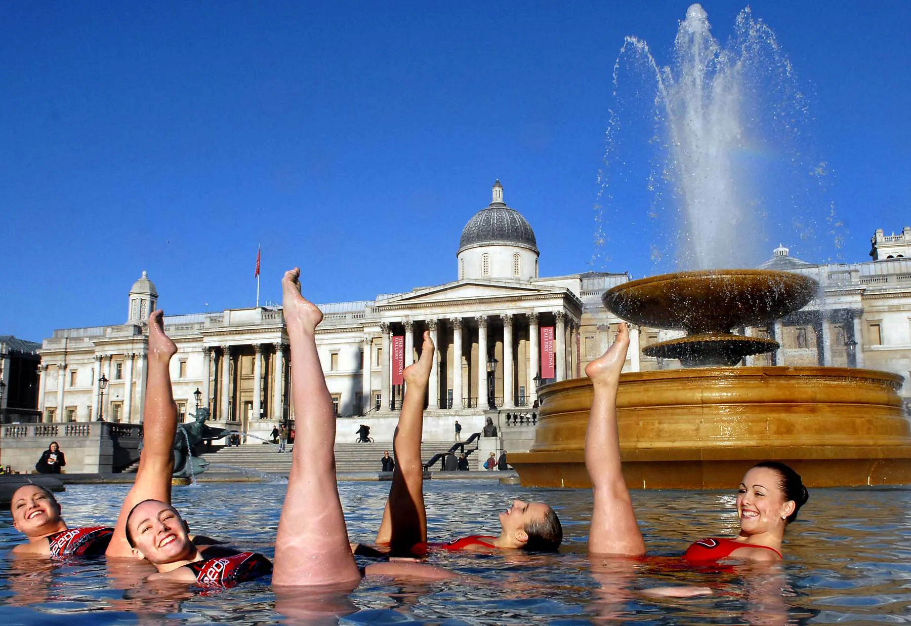 Synchronised swimmers attempt to achieve a Guinness World Record for “the most ballet leg switches in one minute” in a fountain in Trafalgar Square in London, November 9, 2006. November 9 marked the second annual Guinness World Records Day, an international effort that sees hopefuls across the world attempt to break their very own record. (Photo by Bertrand Langlois/AFP Photo)