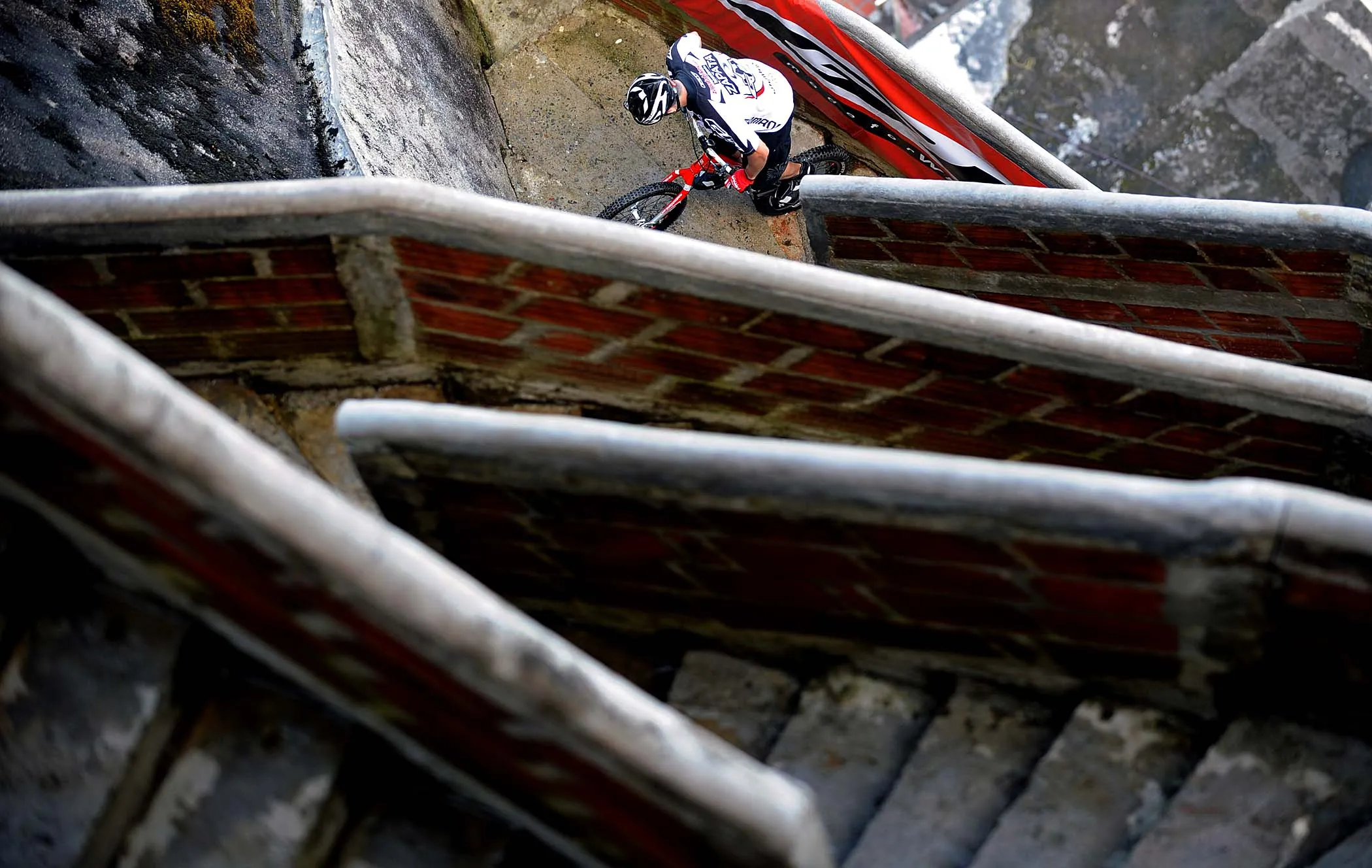 Cyclist Javier Zapata rides up the stairs of the Piedra del Penol monolith on November 21, 2010 in Guatape municipality, east of Antioquia department, Colombia. Zapata rode up 649 steps, with a time of 43 minutes, setting the Guinness World Record. (Photo by Raul Arboleda/AFP Photo)