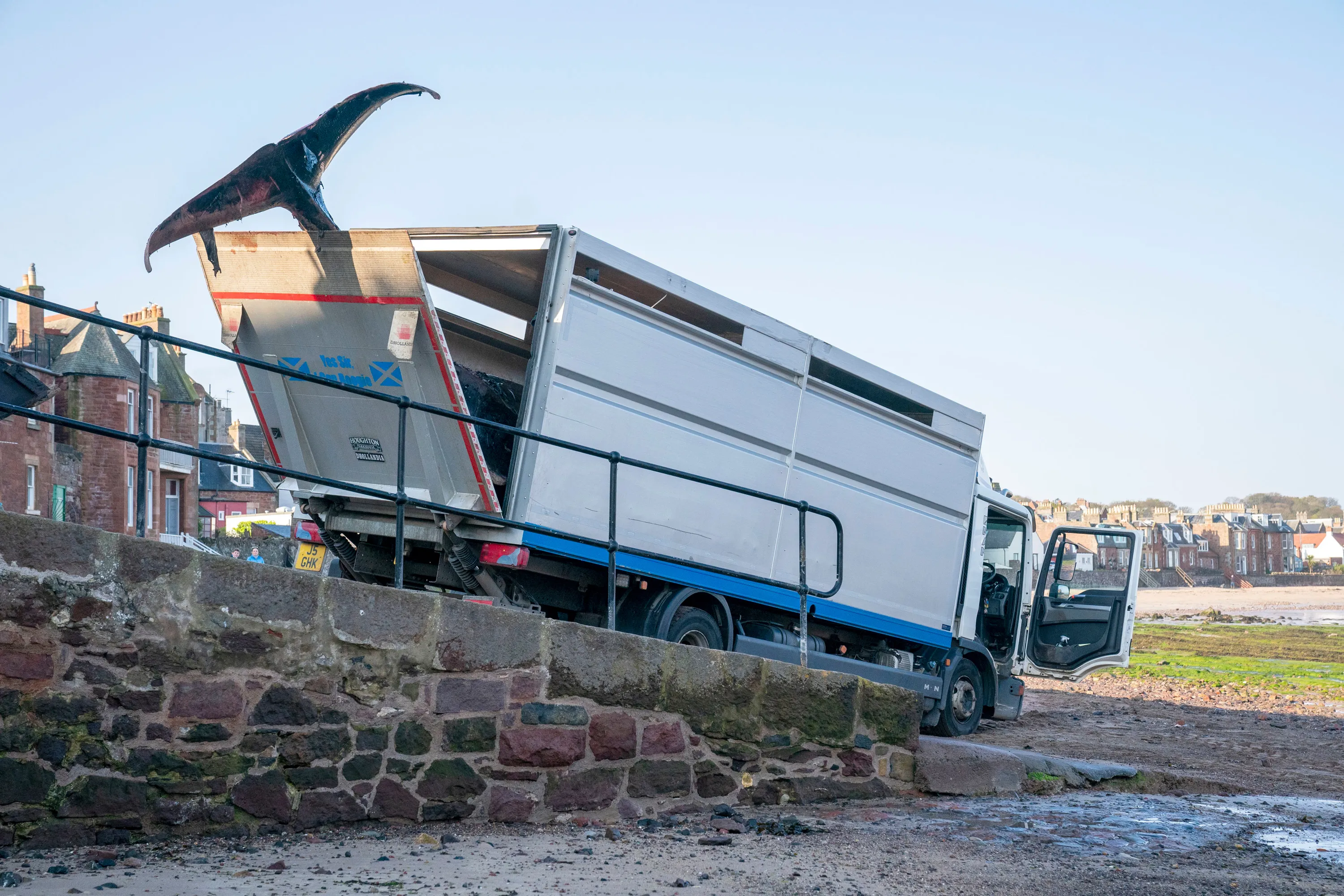 A dead minke whale which washed up on the West Bay beach in North Berwick, East Lothian, on Wednesday is taken away on Friday, April 21, 2023. The area around the whale has been cordoned off by police as the carcass is removed. (Photo by Jane Barlow/PA Images via Getty Images)