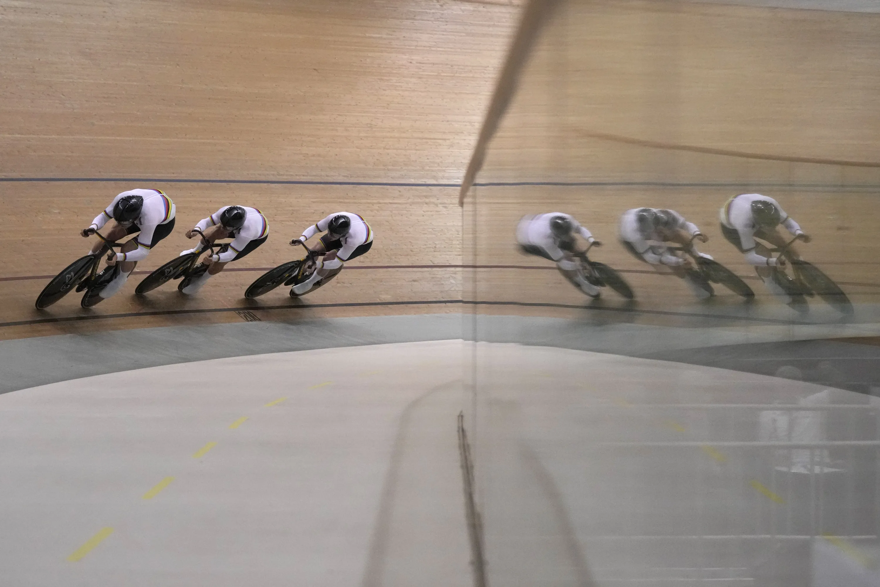 Team Australia competes during the men's team sprint qualifying round at the UCI Track Nations Cup track cycling championship at Jakarta International Velodrome in Jakarta, Indonesia, Friday, February 24, 2023. (Photo by Dita Alangkara/AP Photo)