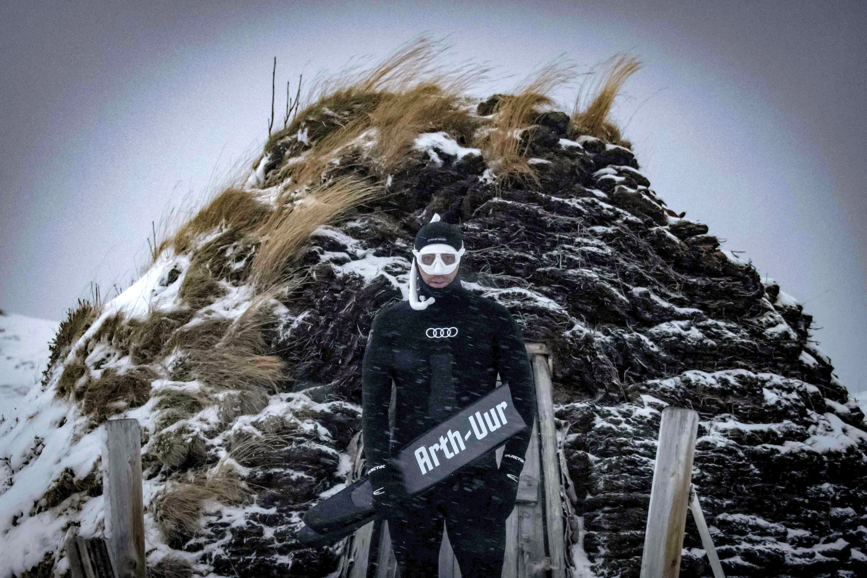 Five times freediving World Champion France's Arthur Guerin-Boeri poses prior to dives to spot Orcas (Killer Whales), in the Spildra Island northern Arctic Circle, on January 26, 2023. (Photo by Olivier Morin/AFP Photo)