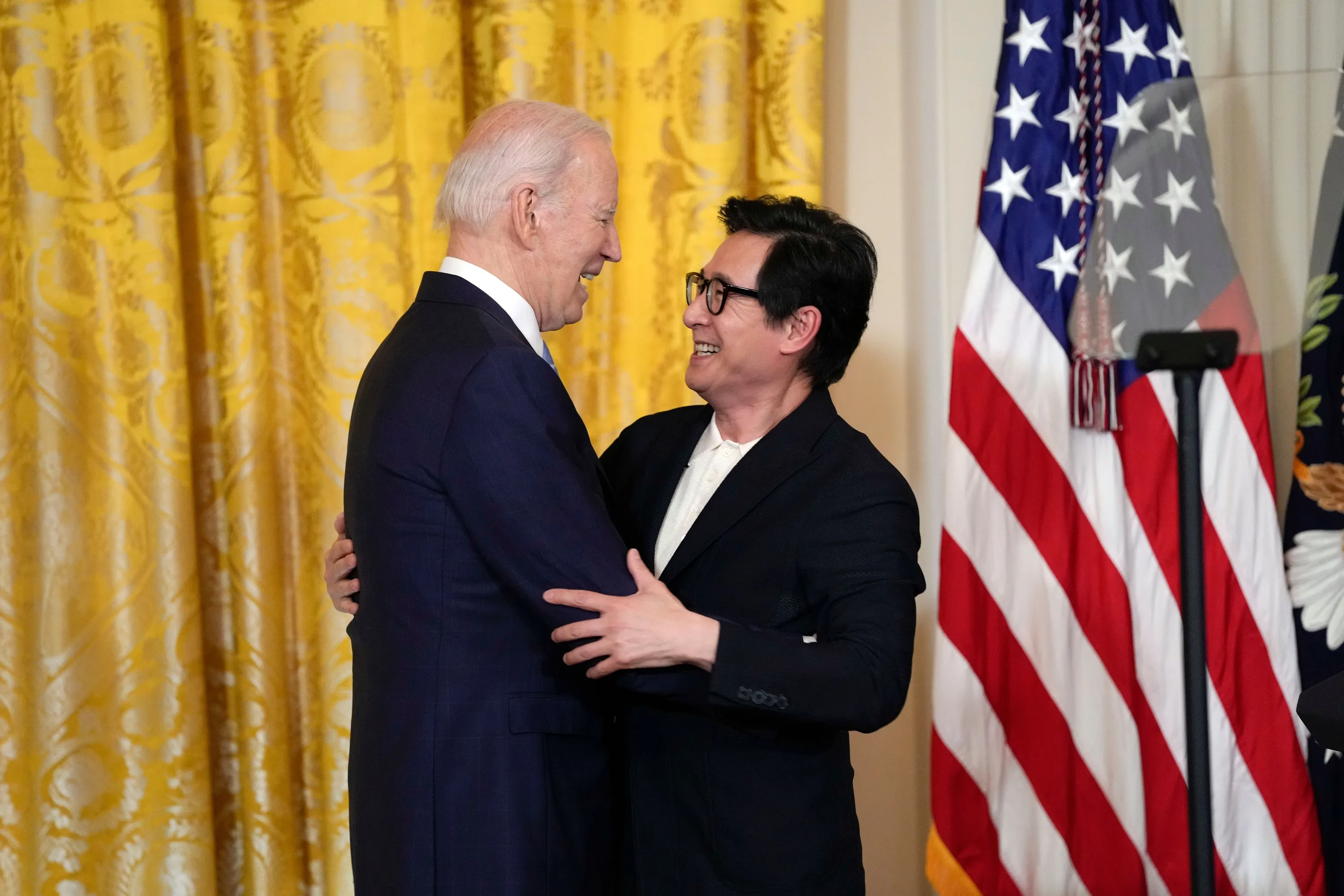 Actor Ke Huy Quan hugs President Joe Biden after he introduced Biden to speak before a screening of the series “American Born Chinese” in the East Room of the White House in Washington. The screening was held in celebration of Asian American, Native Hawaiian, and Pacific Islander Heritage Month, Monday, May 8, 2023. (Photo by Susan Walsh/AP Photo)