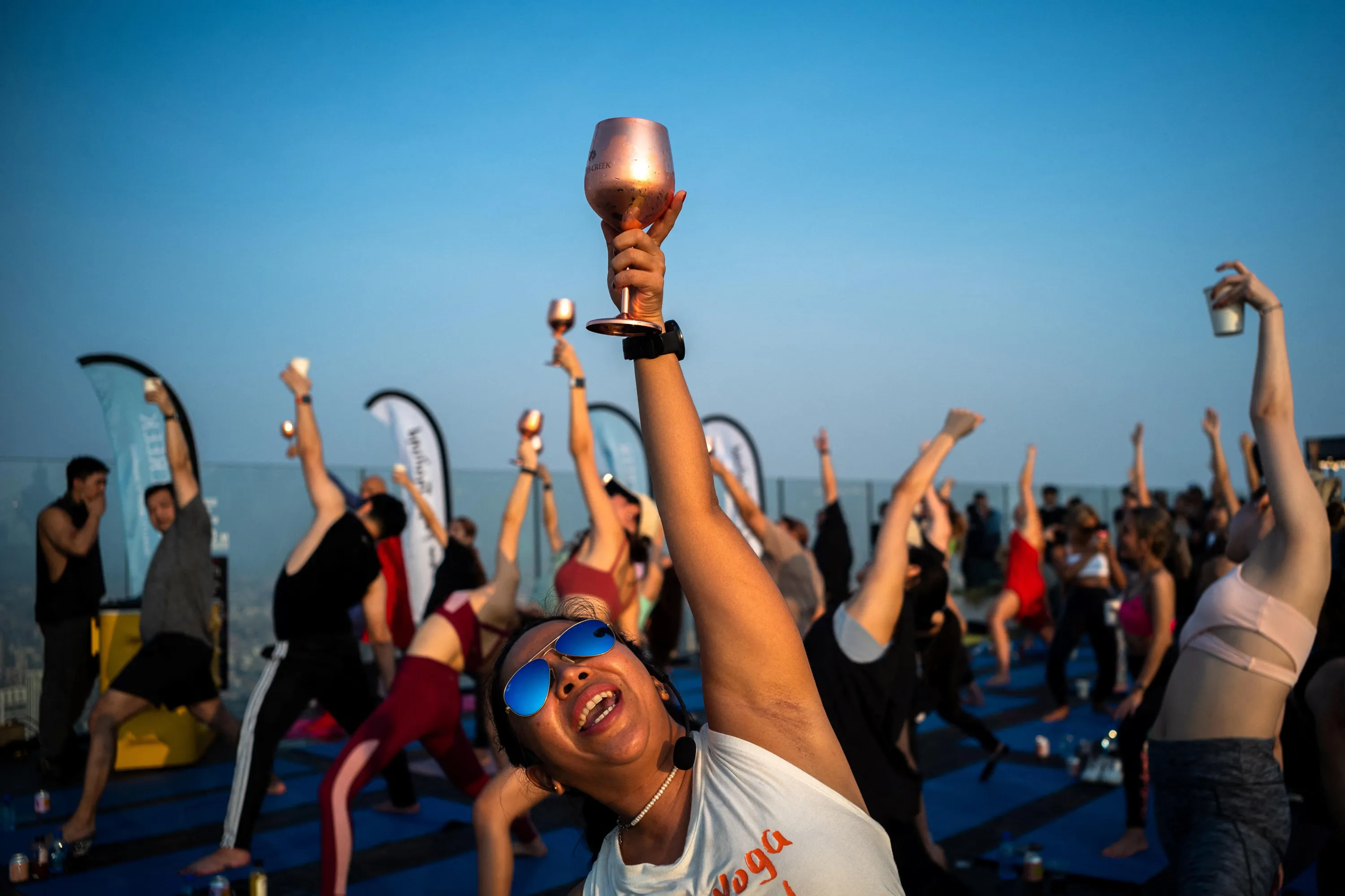 Yoga enthusiasts perform a yoga exercise in a Sunrise Wine Yoga class on the Mahanakhon Skywalk rooftop at the King Power Mahanakhon building in Bangkok, Thailand on April 8, 2023. (Photo by Athit Perawongmetha/Reuters)