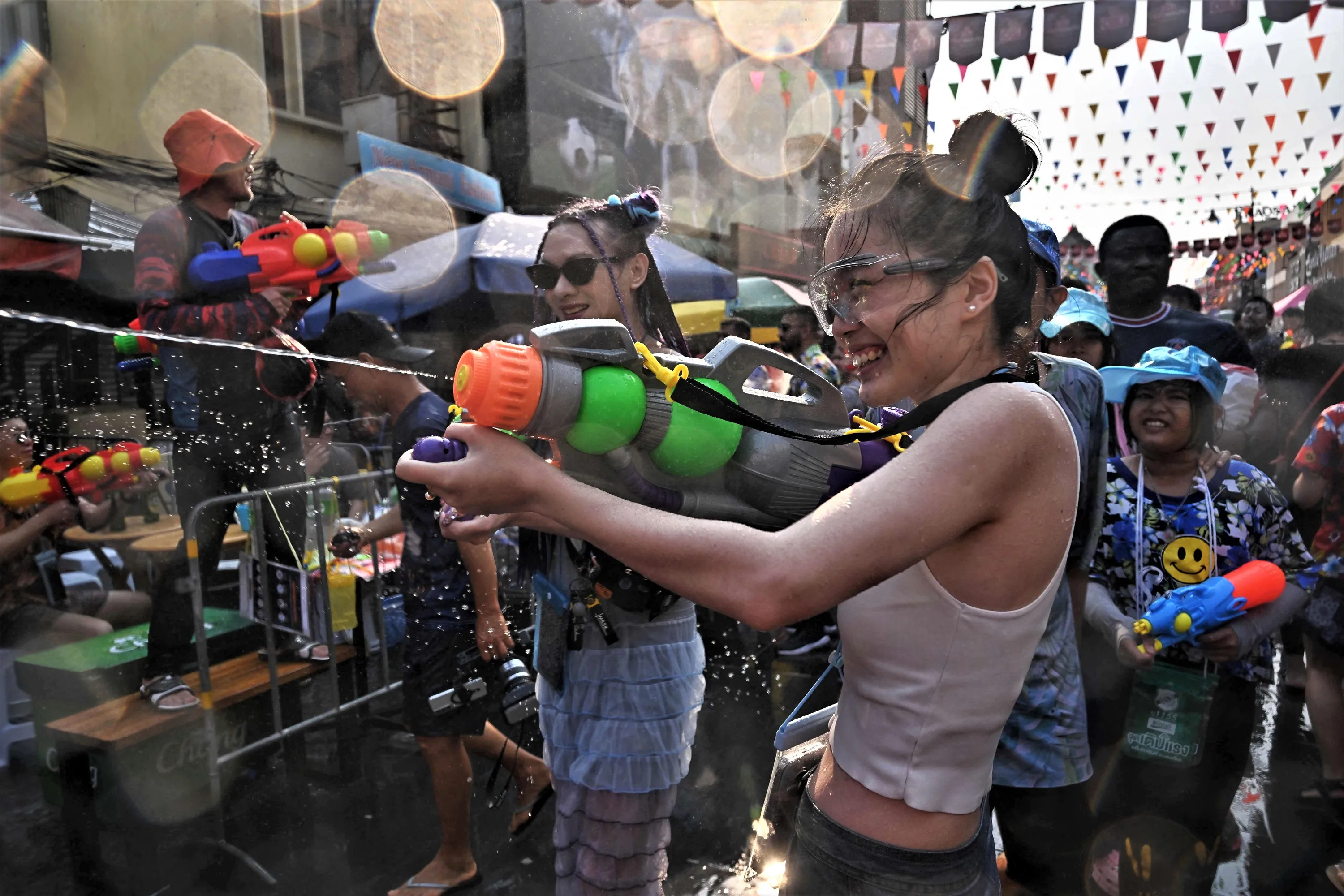 People take part in mass water fights during the first day of Songkran, or Thai New Year, on Khao San Road in Bangkok on April 13, 2023. (Photo by Lillian Suwanrumpha/AFP Photo)