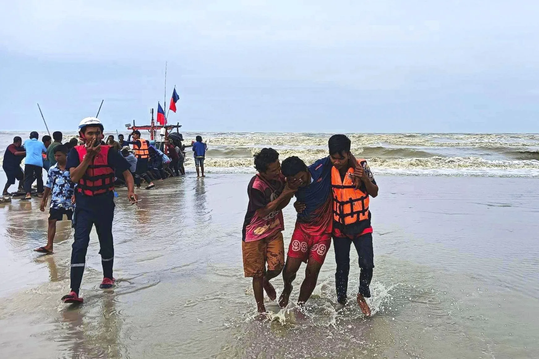 In this photo released by the People Unity Foundation, rescuers from the charitable organization help a survivor from a boat that capsized off the coast of Nakhon Sri Thammarat province, southern Thailand on April 16, 2023. A freak storm in southern Thailand capsized a dozen fishing boats and killed multiple people, but more than 100 others who were also at sea have been accounted for, officials said Monday. (Photo by People Unity Foundation via AP Photo)