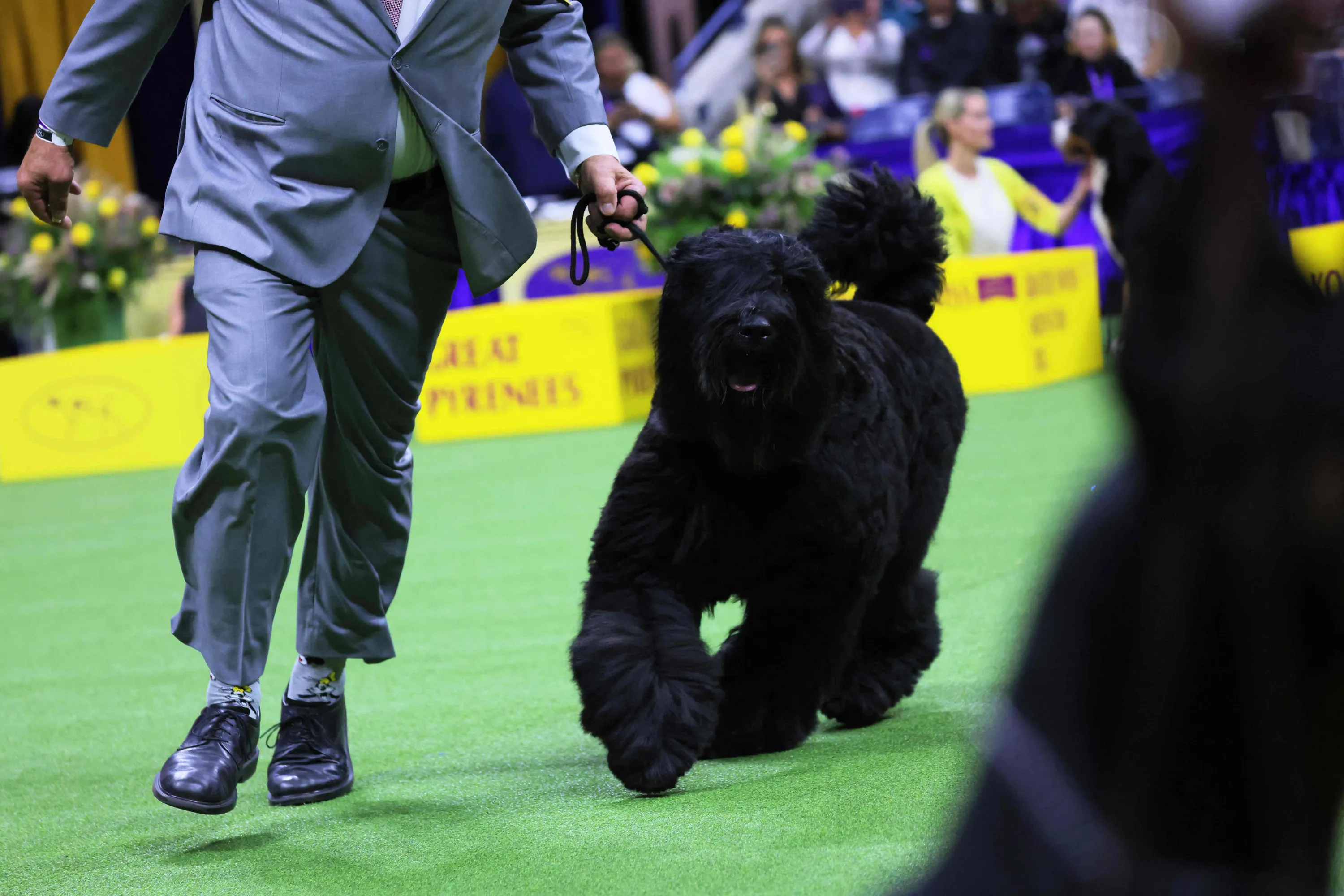 A Black Russian Terrier competes in the Working Group event during the Westminster Kennel Club Dog Show at the USTA Billie Jean King National Tennis Center on May 09, 2023 in Flushing Meadows-Corona Park neighborhood of Queens borough in New York City. The 147th Annual Westminster Kennel Club Dog Show featured over 3,000 dogs with over 200 breeds participating in four different competitions. (Photo by Michael M. Santiago/Getty Images/AFP Photo)