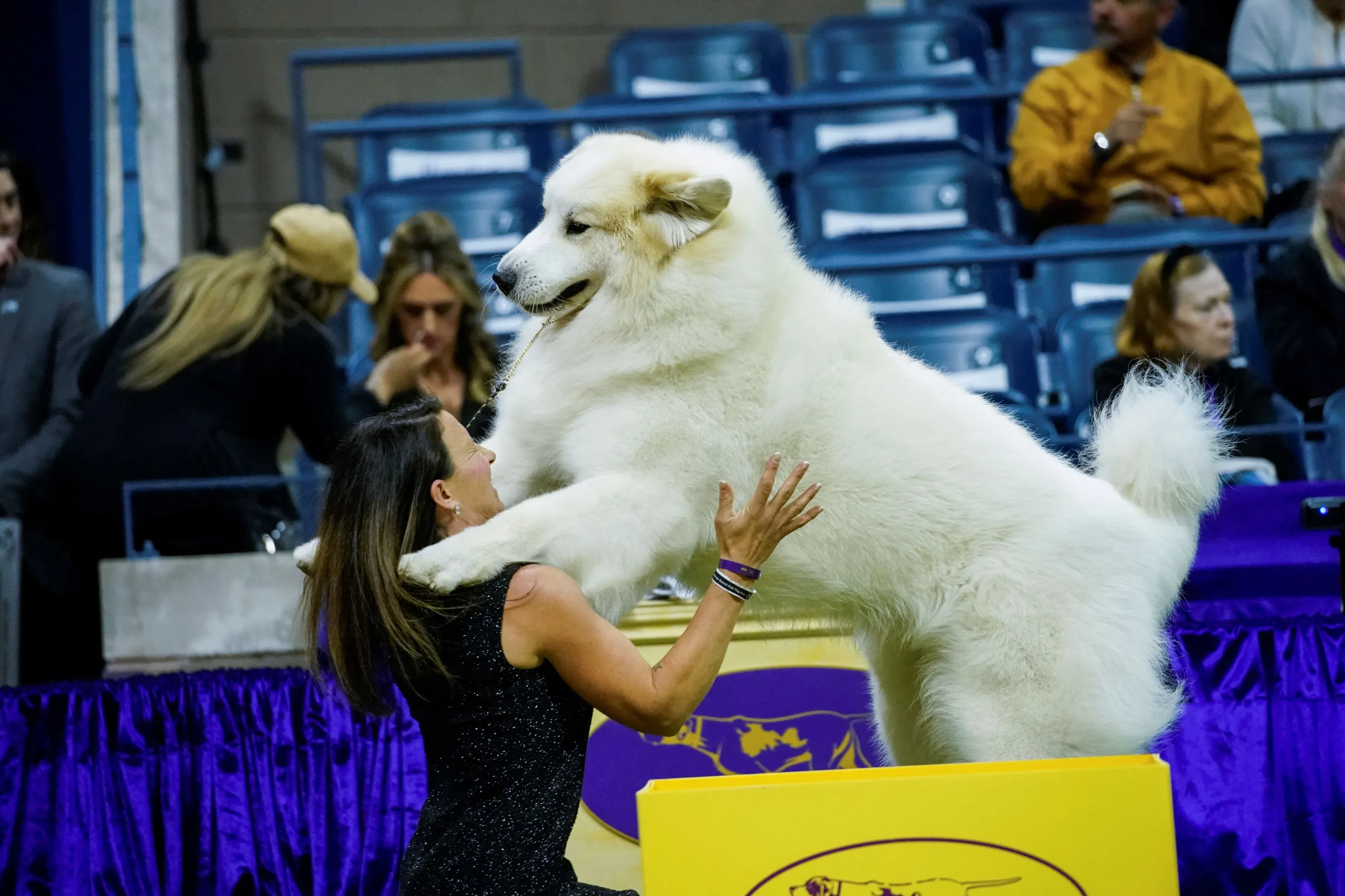 Sebastian, a Great Pyrenees, plays with its handler as they compete in the Working Group during the 147th Westminster Kennel Club Dog Show at the USTA Billie Jean King National Tennis Center in New York, U.S., May 9, 2023. (Photo by Eduardo Munoz/Reuters)