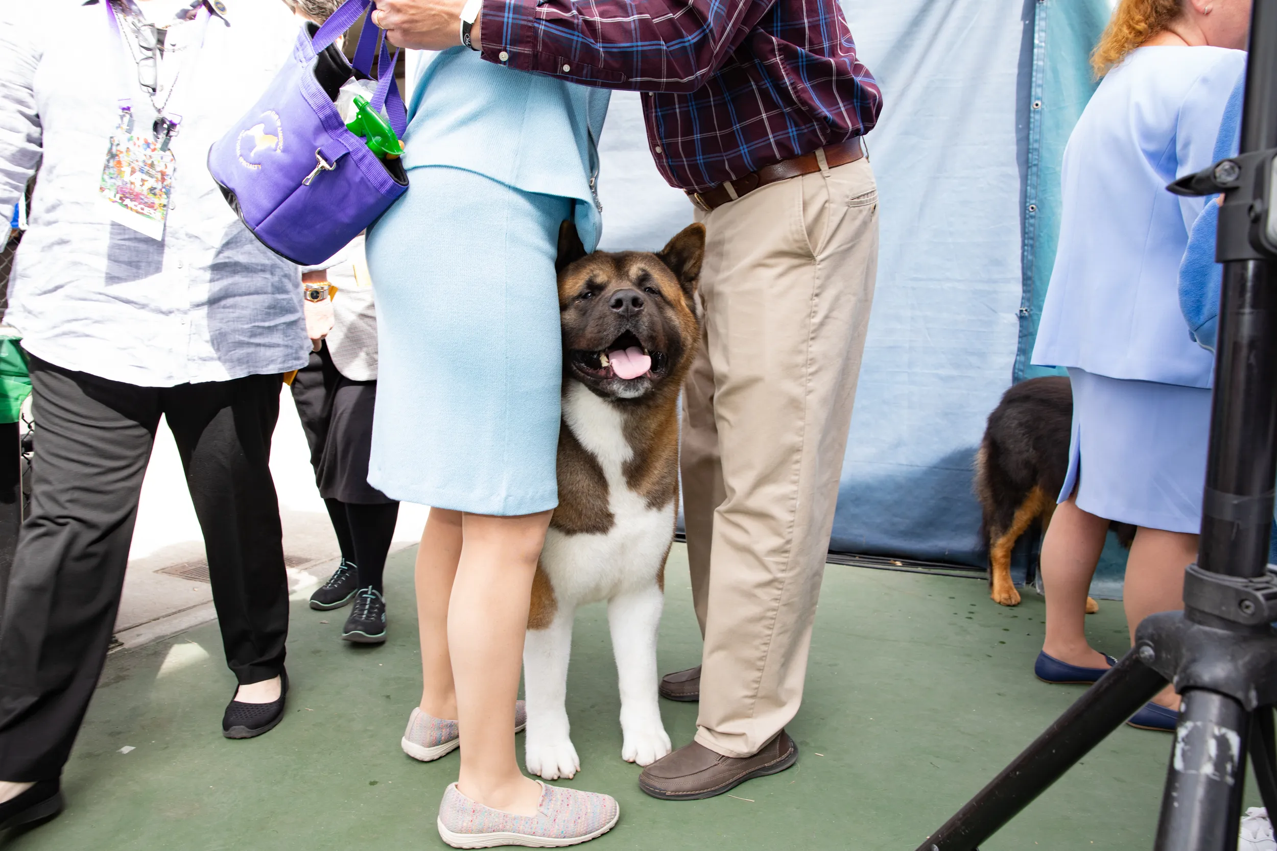 Nancy King (Blue skirt) and Kenzo the Akita at the 147th Annual Westminster Kennel Club Dog Show on May 9, 2023. (Photo by Peter Fisher for The Washington Post)