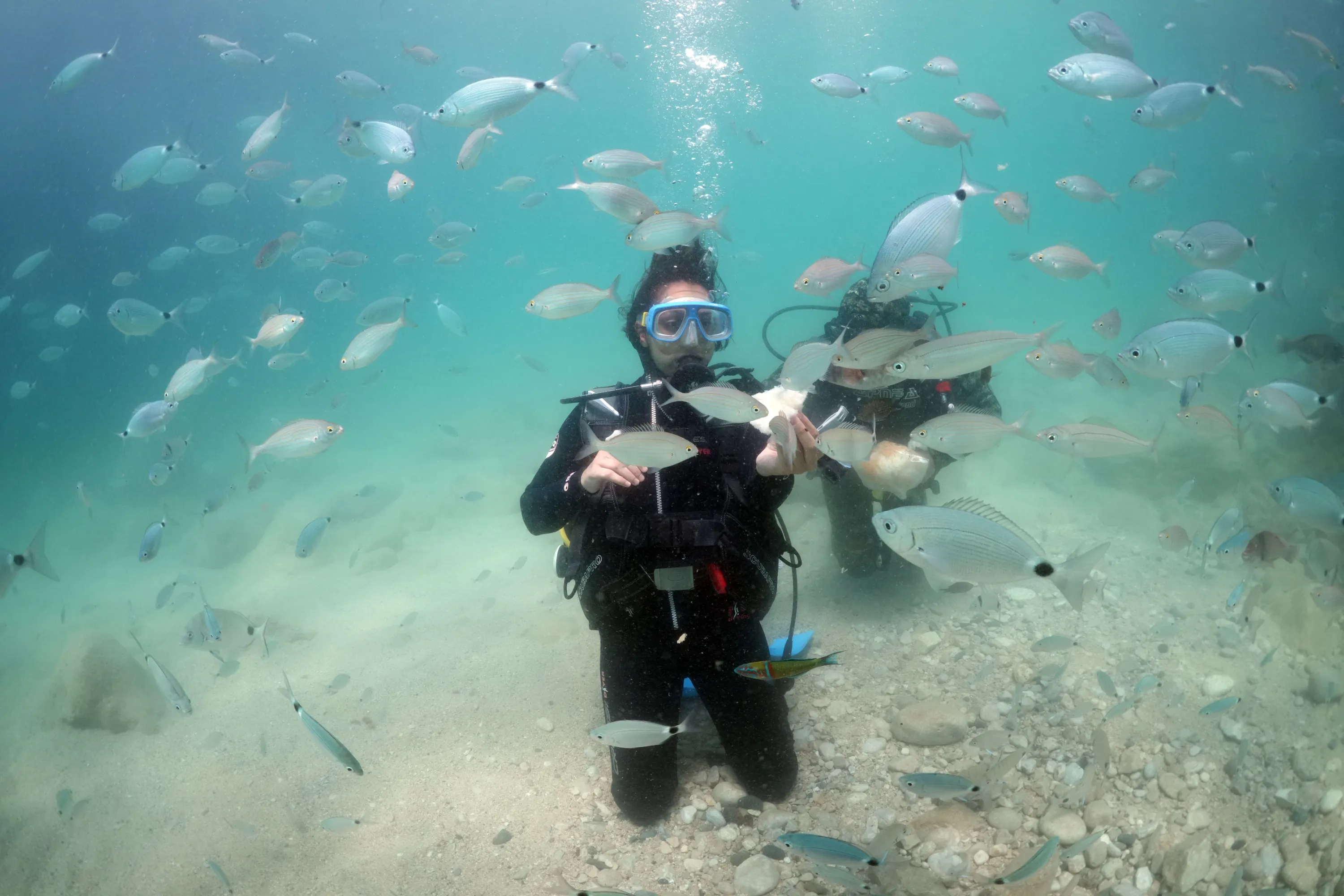 Underwater Director of Photography Tahsin Ceylan and his team help 14 year-old girl Inci Inci, who survived the earthquakes in Hatay, to dive to celebrate the 23rd April National Sovereignty and Children's Day under water in Kemer district of Antalya, Turkiye on April 21, 2023. (Photo by Tahsin Ceylan/Anadolu Agency via Getty Images)