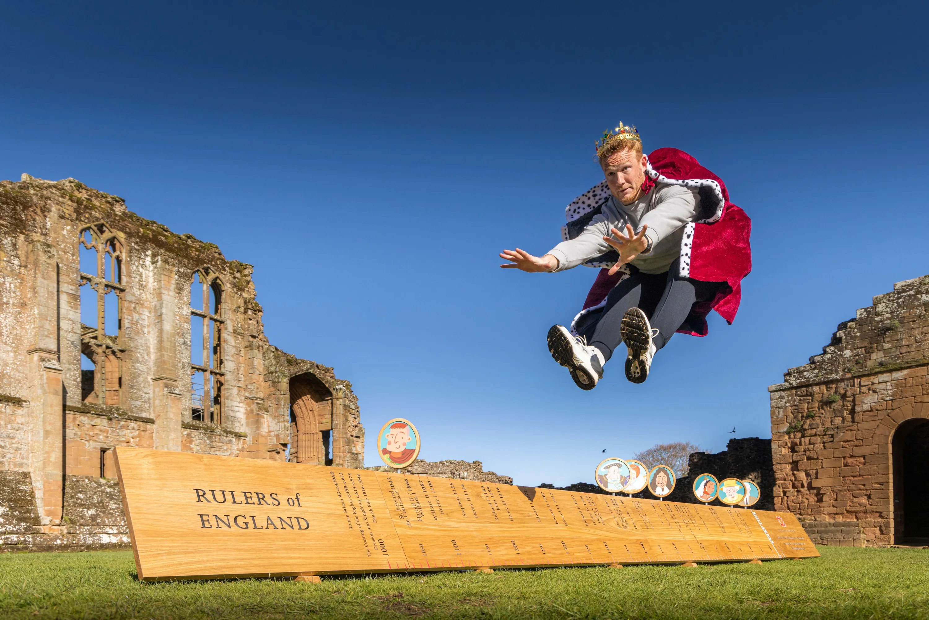 The Olympic track-and-field star, British track and field athlete Greg Rutherford jumps for joy after King Charles is added to English Heritage’s Rulers of England ruler in the last decade of April 2023. (Photo by English Heritage)