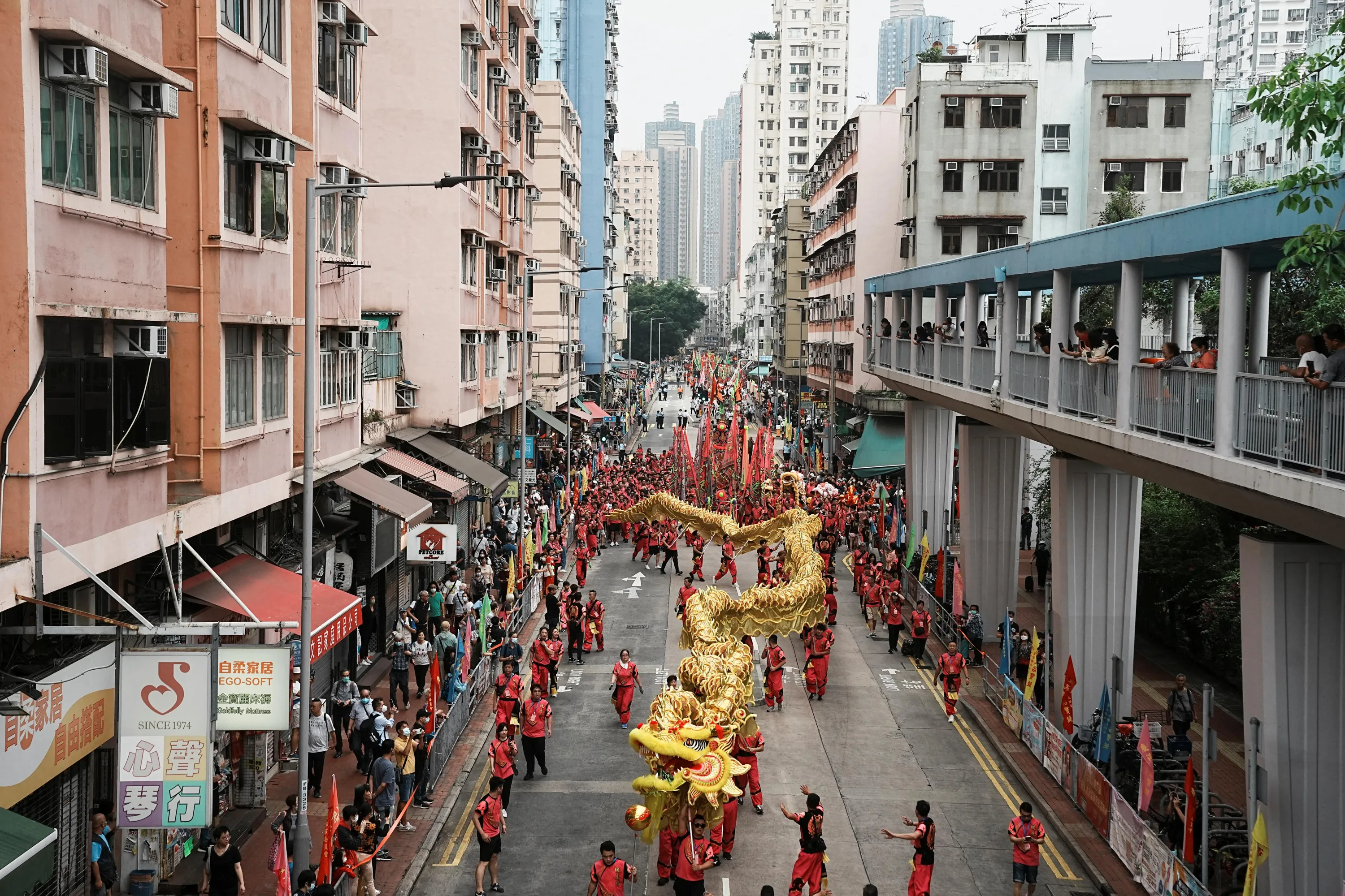 Participants march with a golden dragon during a parade celebrating Tin Hau festival at Yuen Long district, in Hong Kong, China on May 12, 2023. (Photo by Lam Yik/Reuters)
