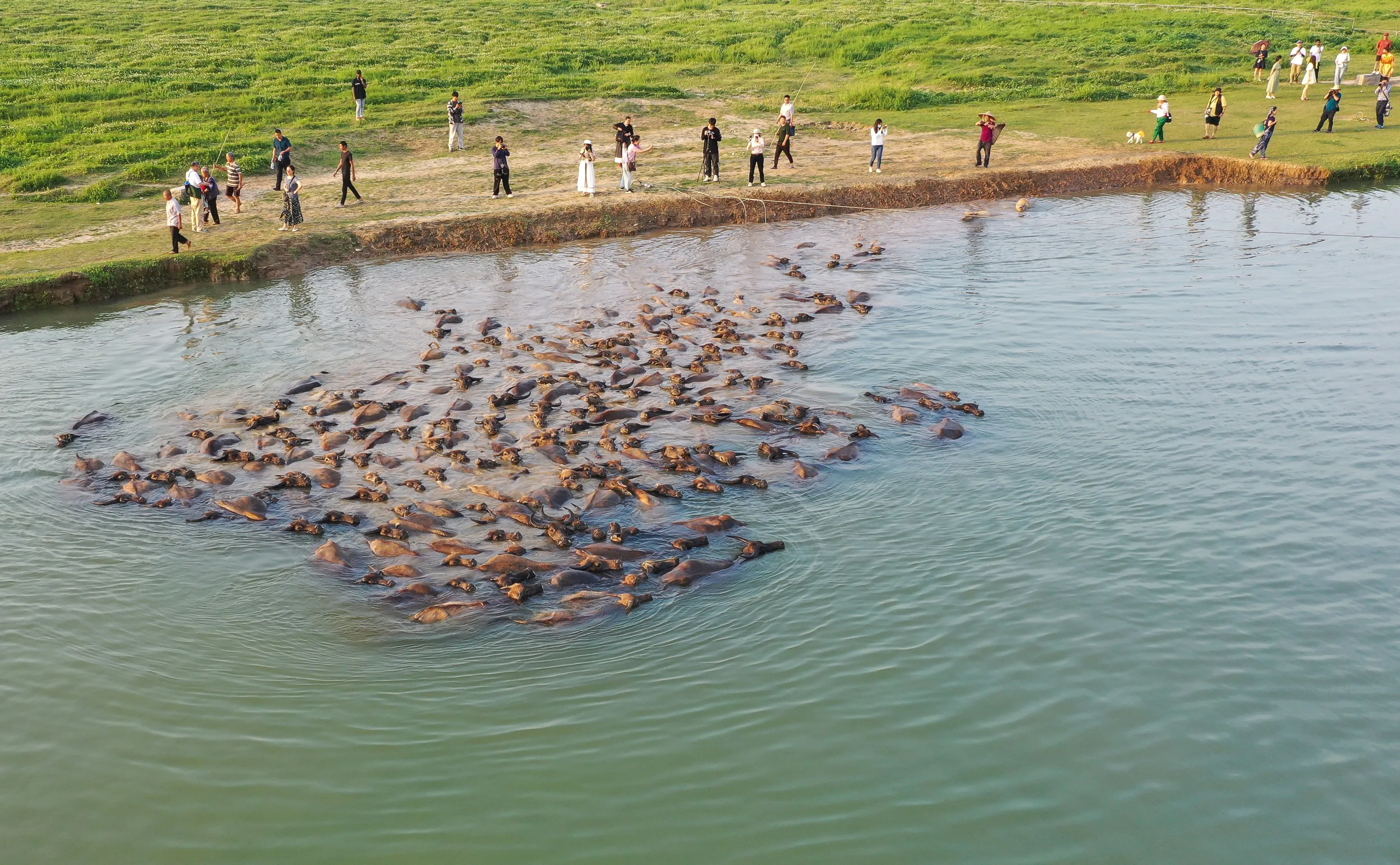 Aerial view of tourists watching a herd of water buffaloes returning home on May 18, 2023 in Nanchong, Sichuan Province of China. Hundreds of water buffaloes swam across the Jialing River at sunrise to graze on an island with lush green grassland in the middle of the river and return at sunset. (Photo by VCG/VCG via Getty Images)