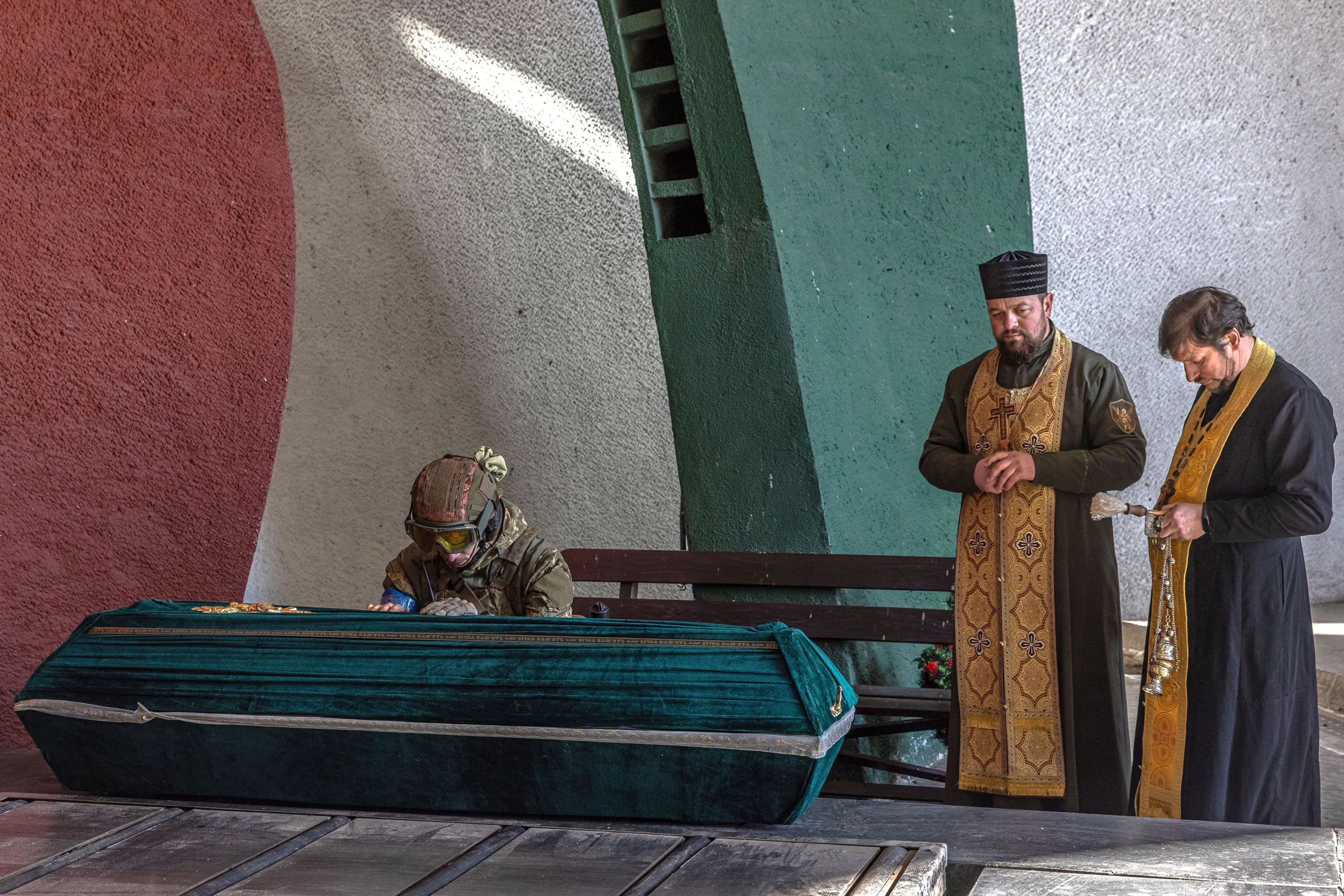 Yaroslav (C), a member of the Ukrainian military, touches the closed coffin with the body of his father Roman, a fallen Ukrainian soldier killed in the Kyiv region during the Russian invasion of Ukraine, at a cremation ceremony in a crematorium, in Kyiv, Ukraine, 15 March 2022. On 24 February Russian troops had entered Ukrainian territory in what the Russian president declared a “special military operation”, resulting in fighting and destruction in the country, a huge flow of refugees, and multiple sanctions against Russia. (Photo by Roman Pilipey/EPA/EFE)