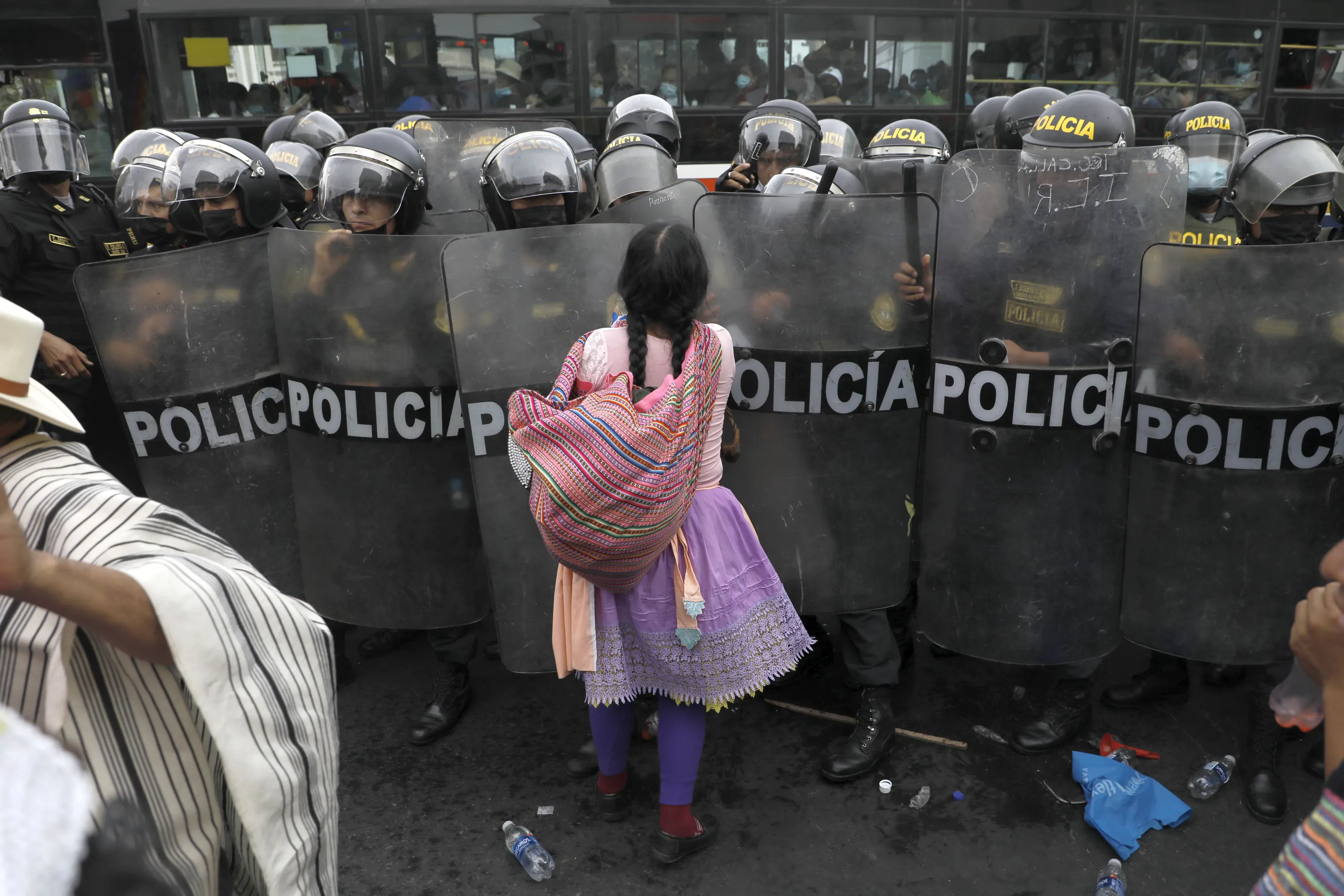 Supporters of the Peruvian government participate in a demonstration in front of the Congress of the Republic during the plenary session in which legislators will debate the approval of the fourth cabinet of President Pedro Castillo in Lima, on March 8, 2022. (Photo by Klebher Vasquez/Anadolu Agency via Getty Images)